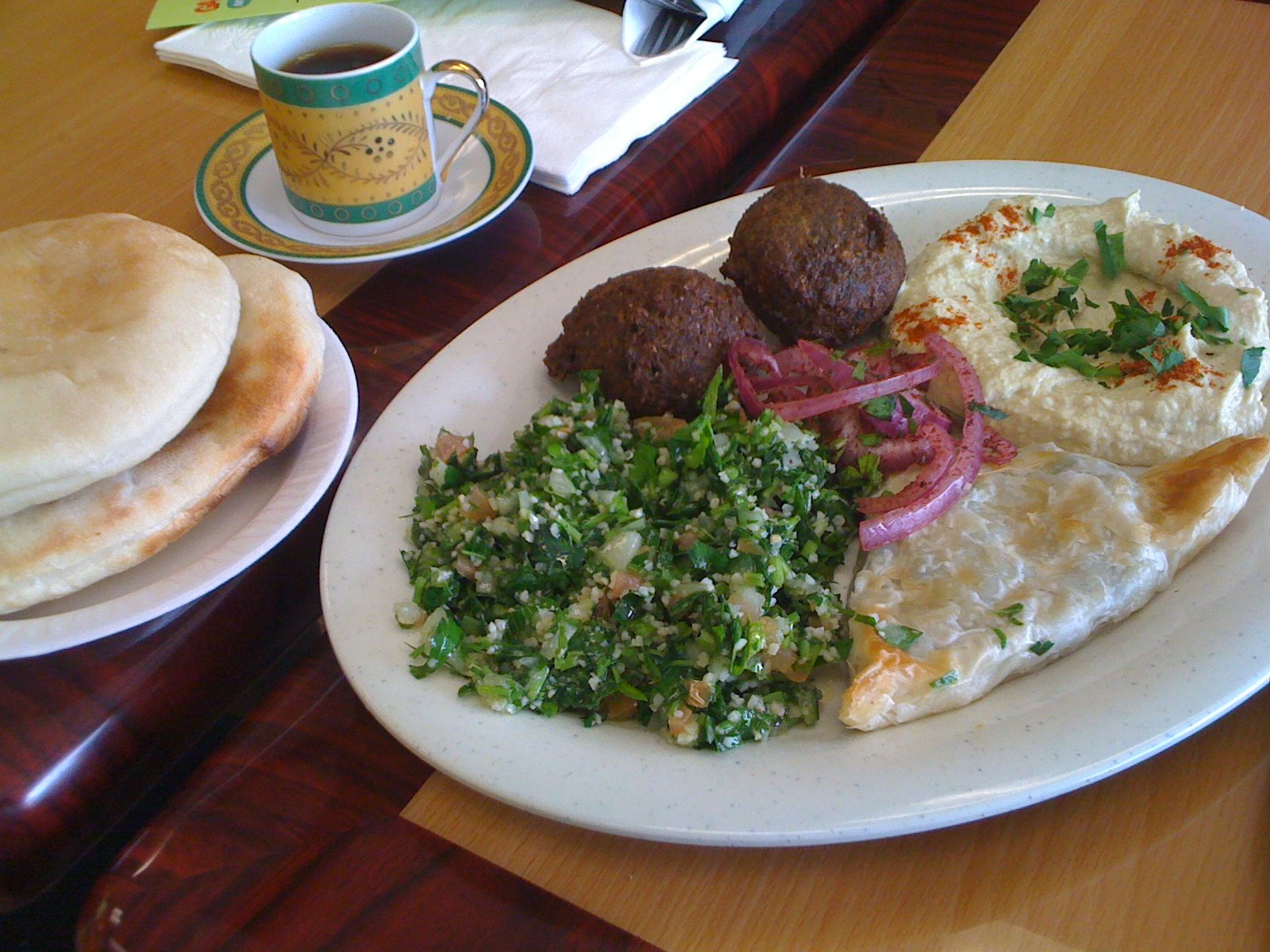 I ordered the "Combo 3"($8.99)- an assortment of house made hummus, tabouli, falafel and spanakopita. House made everything.: The falafel was made of fresh chickpeas (not the powdered mix) and were light, airy, tender and just crispy on the outside. The spanakopita was crispy (not soggy on the bottom) and filled with Feta cheese as well as spinach and onions. The tabouli was very fresh parsley and bulghur, feta, onions and lemon juice. The hummus was excellent. All were done quite well. The Mister and I shared a cup of Turkish coffee ($1.99).