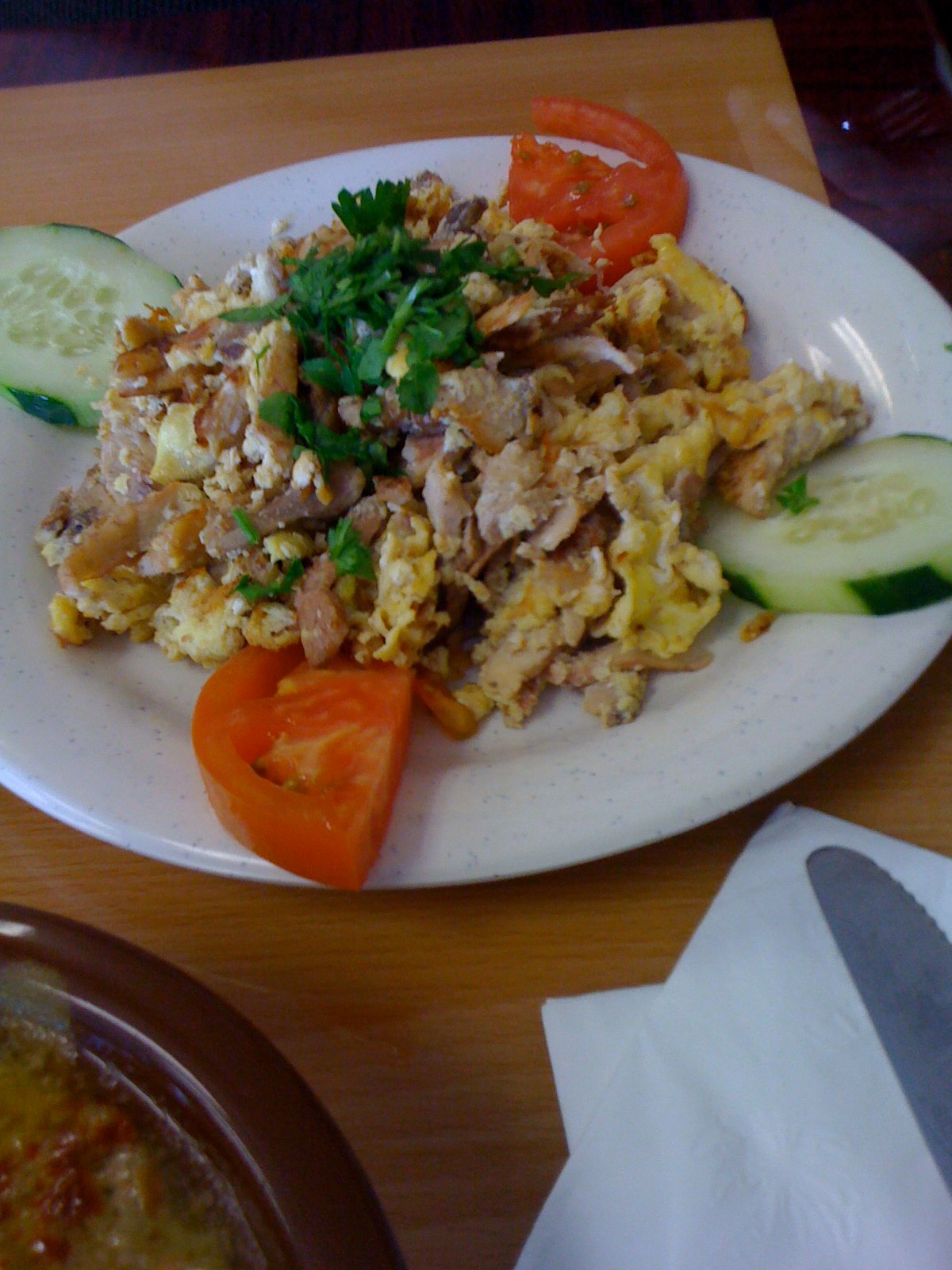 The Mister tried the scrambled eggs with chicken schawarma ($6.99). There was more meat than egg. Simple, flavorful, moist. We figured two eggs were used.