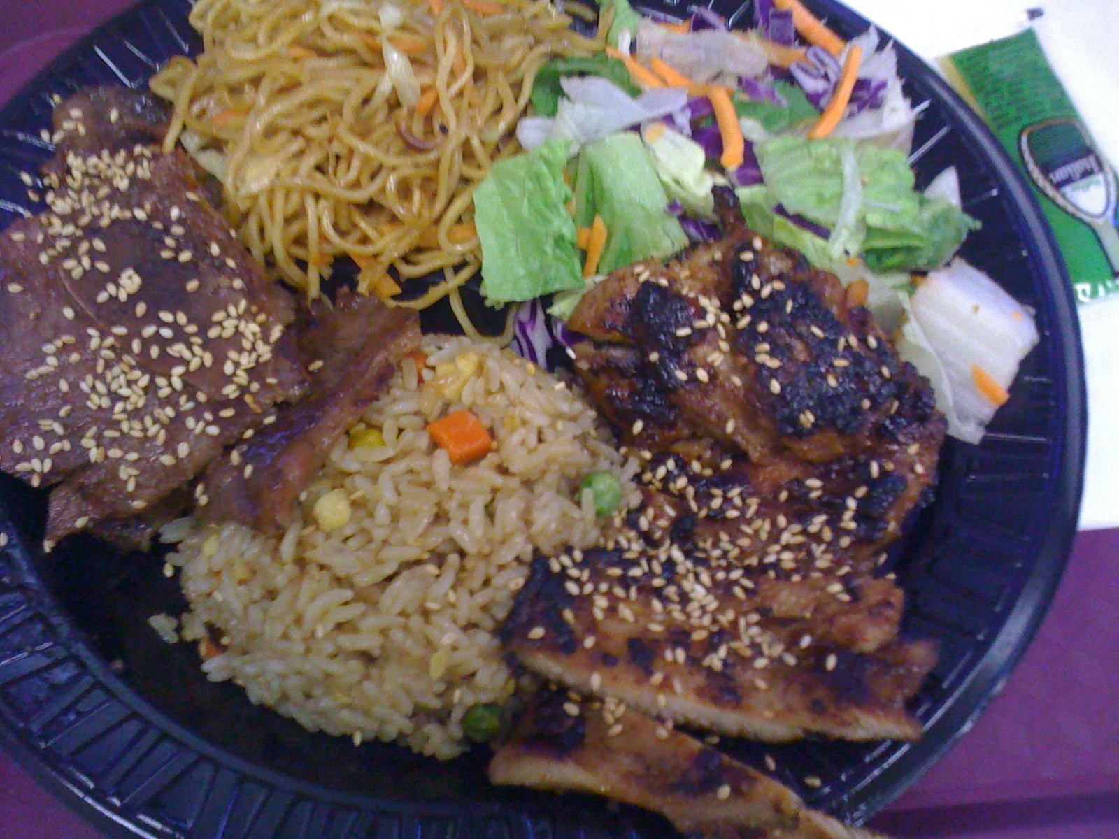 All the items are not salty and not over-sauced. The rice is good, freshly fried, with some (probably) frozen vegetables and egg added. The stir fried noodles are pretty good with cabbage and carrots added. The salad comes with a packet of Italian dressing and is pretty standard.