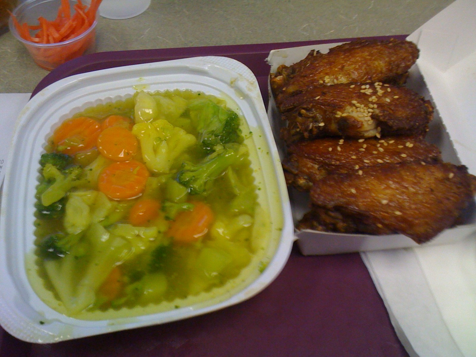 Sometimes, I want fried and get the large order (9) of sesame chicken wings ($3.79). Nicely fried, not greasy, topped with sesame seeds, juicy meaty and good. This day , I decided to get a side of vegetables ($1.49). This is *not* a weird, badly lit photograph. The vegetables here are what I like to call 'neon veggies'. Broccoli, carrots, cauliflower and some bok choy in this wonderful colored, not salty, thick neon yellow-green sauce. I like it and at least like to think it is a healthy meal…