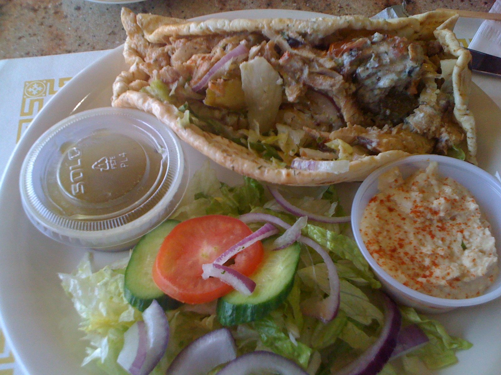 A falafel sandwich ($4.99) was OK good. After having the falafel at Mystic Grill , I am spoiled. These were fresh and kind of fried a bit too long. The flavor of the falafel were good. The sandwich had lettuce, tomato, cucumber and onion and a fresh home made (yogurt based) sauce.