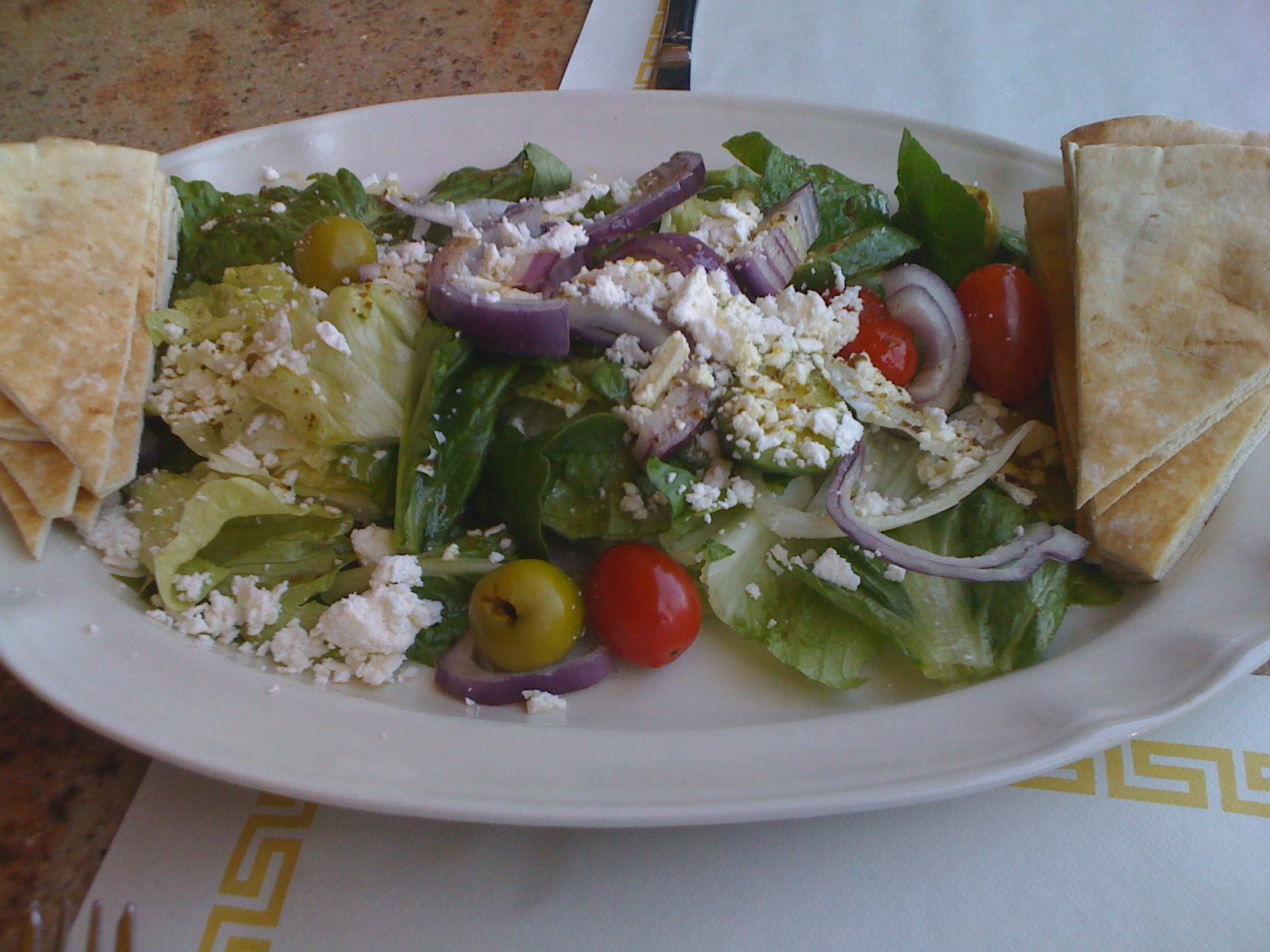 We decided on a Greek side salad ($4.99)to go with the sandwiches we ordered. Lettuce, cucumber, tomato, onion olives, feta and the same house dressing…