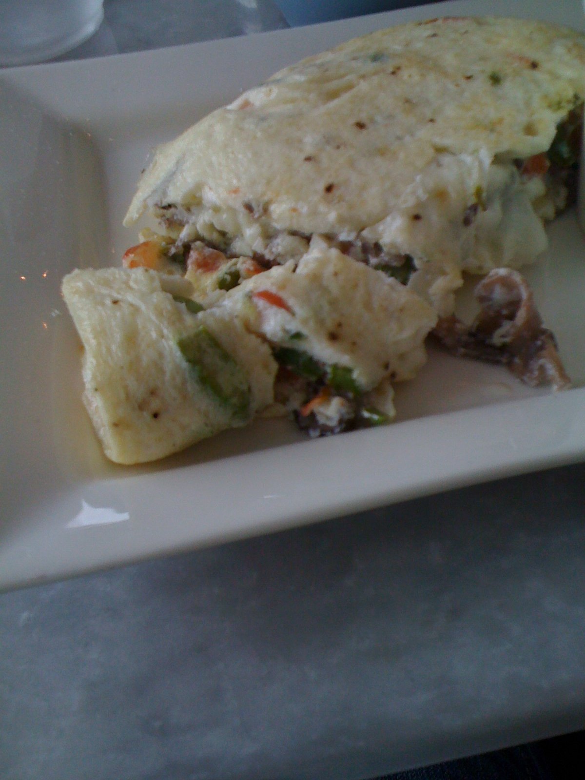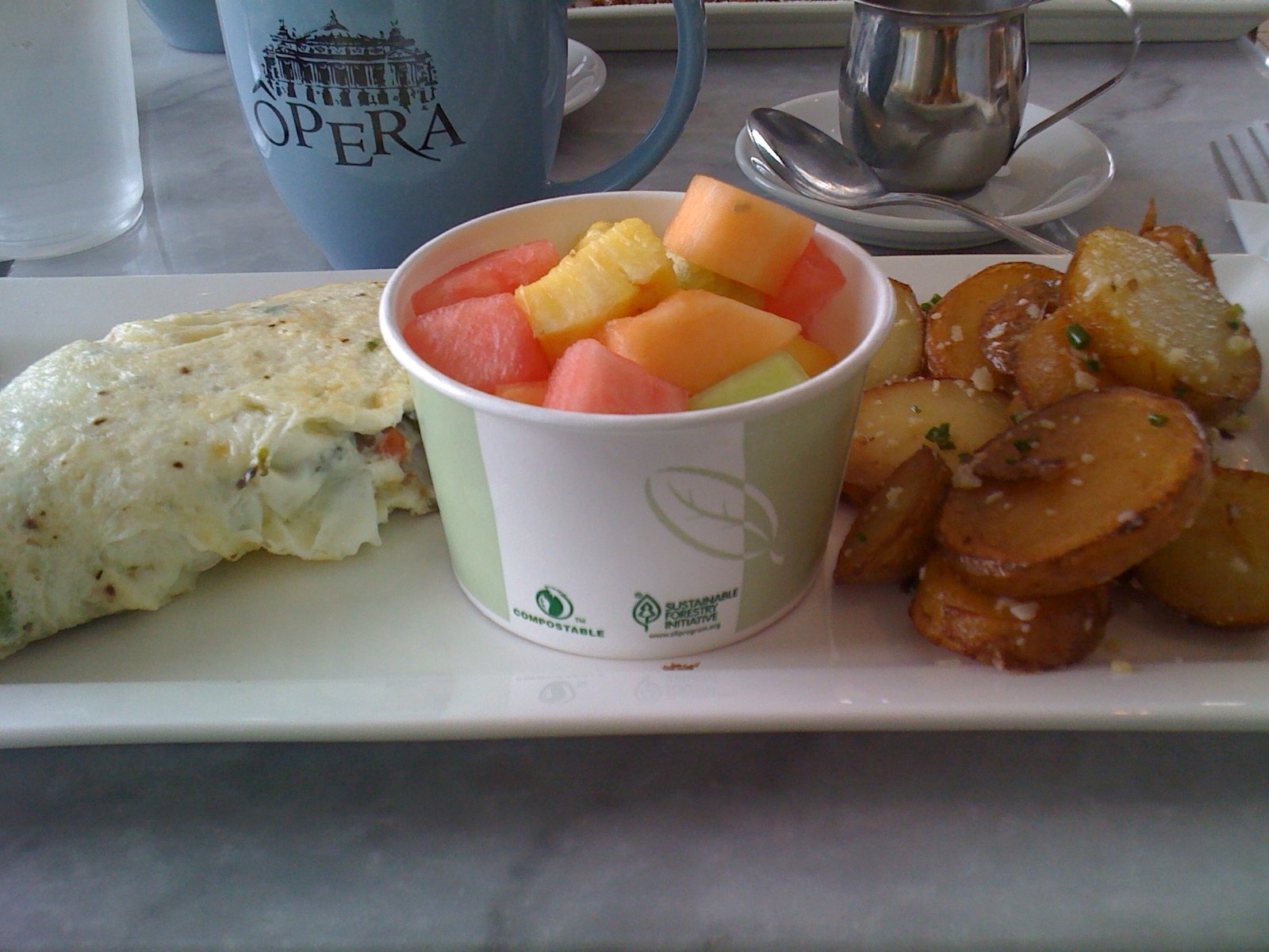 I must confess, I did not expect much at all, but this was the *most* wonderful egg white omelet, perfectly made. Crispy exterior and fluffly light interior. Just like the French Toast. The vegetables had been sauteed and were so fresh and flavorful. The fruit salad was all ripe, good fruit. The potatoes were thick sliced sauteed to a light crispiness and yet were still soft. The Yukon Gold flavor was there.