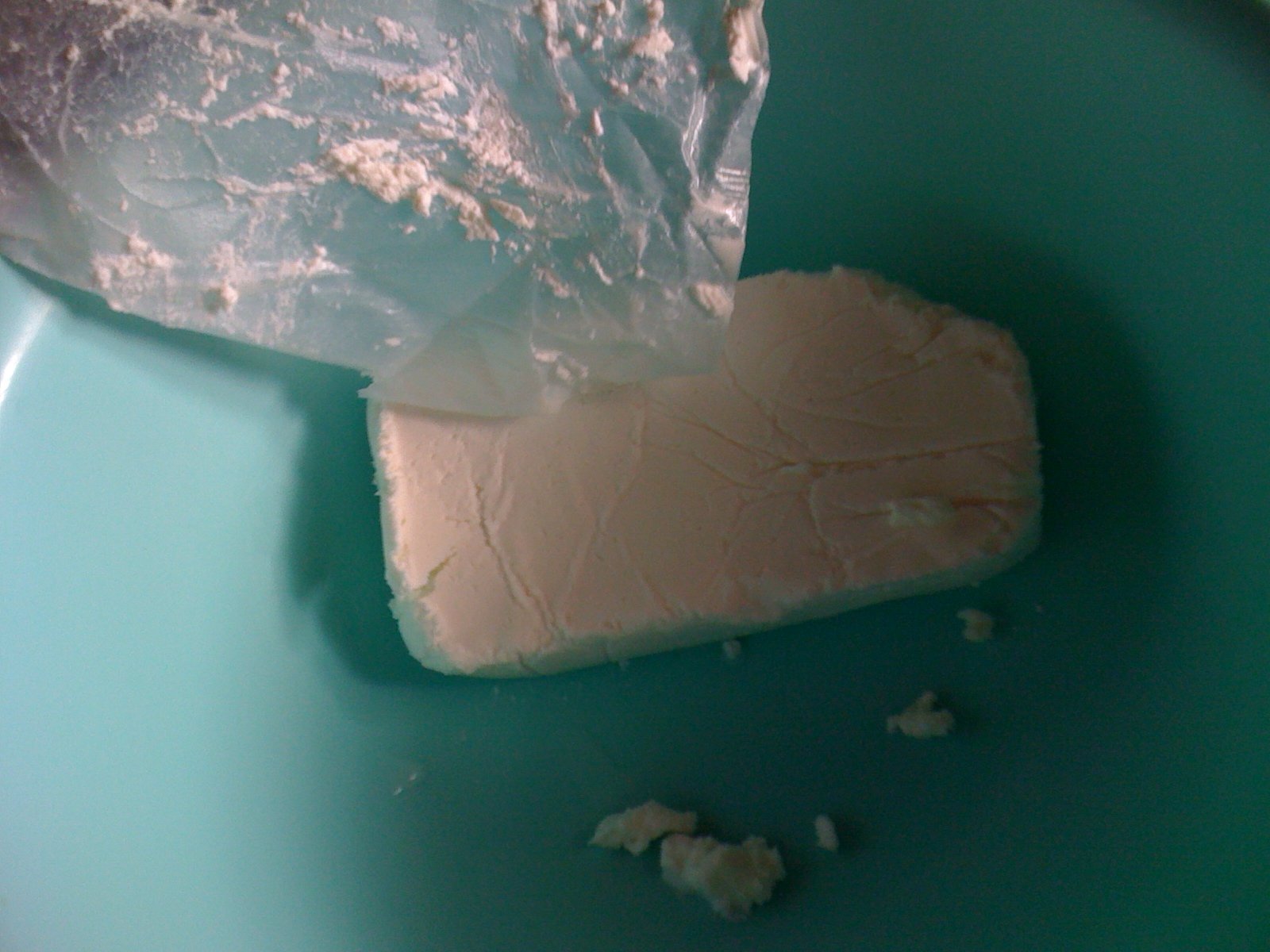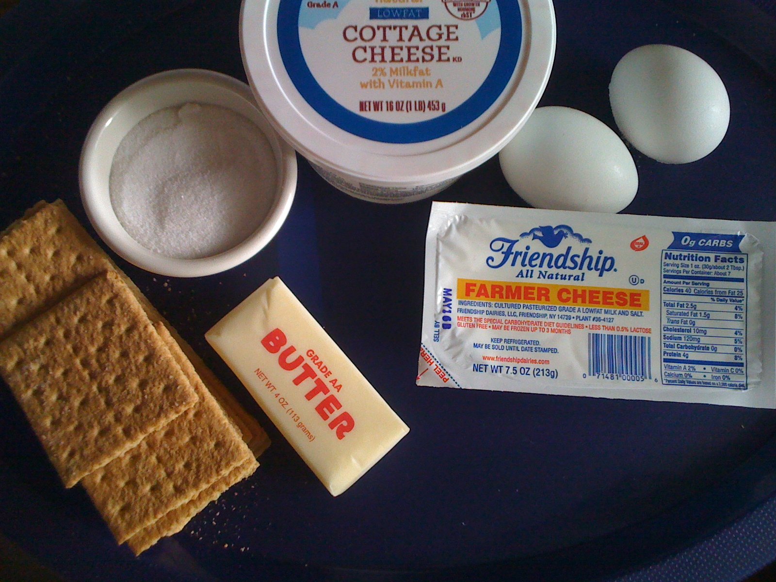 Farmer's cheese when packaged as above, is wrapped in paper inside that package. You can see it is kind of cottage-cheesy in texture. It has a bit more sharp flavor and also seems richer, even more than full fat cottage cheese (which I usually use and which was not on sale when I was buying cheese for this recipe).