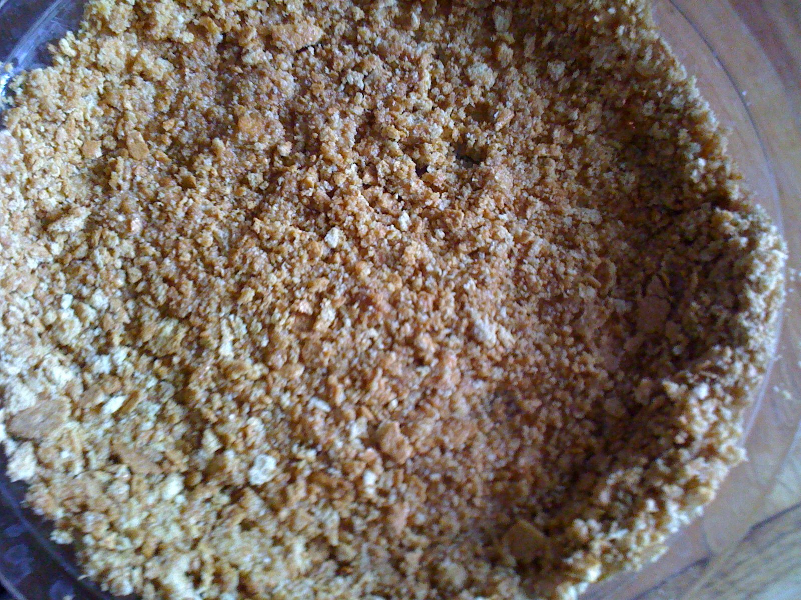 Crush 14 graham crackers-7 doublets per pie plate-with a rolling pin, or just place into the pie plate and crush with the back of a glass. Mix in about a Tablespoon of sugar and about half a stick of melted butter and form the crust to the pie plate. Set aside. (the crust is the only sweet part of the entire dessert)