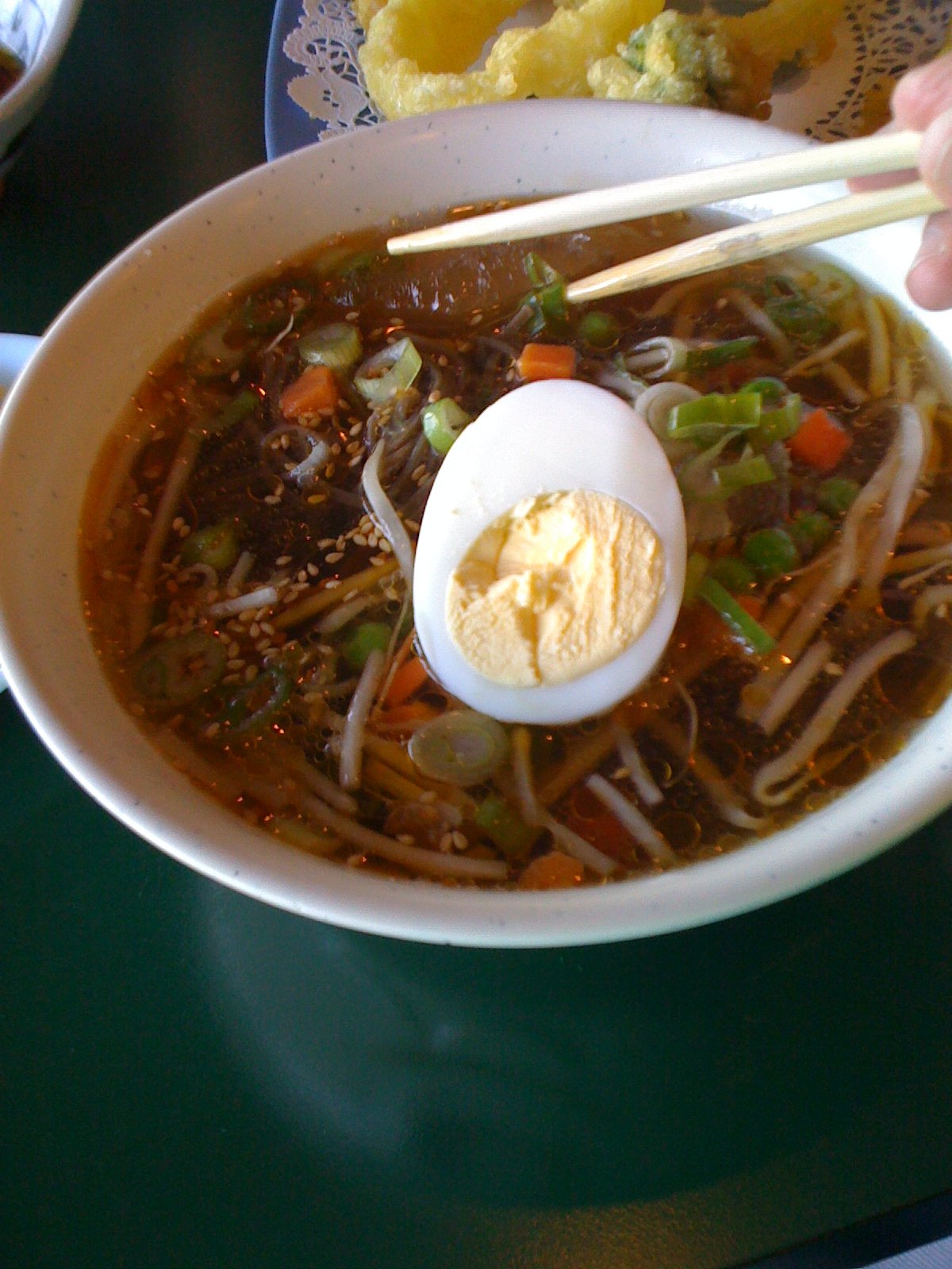 This was *really* good and nothing like I had ever had before. The broth was rich, did not taste watered down, the noodles were excellent. Just the carrots, onions and bean sprouts, as you can see. Sesame oil definitely in the broth…the half hard boiled egg, no meat. Wonderfully unexpected and really good and filling.