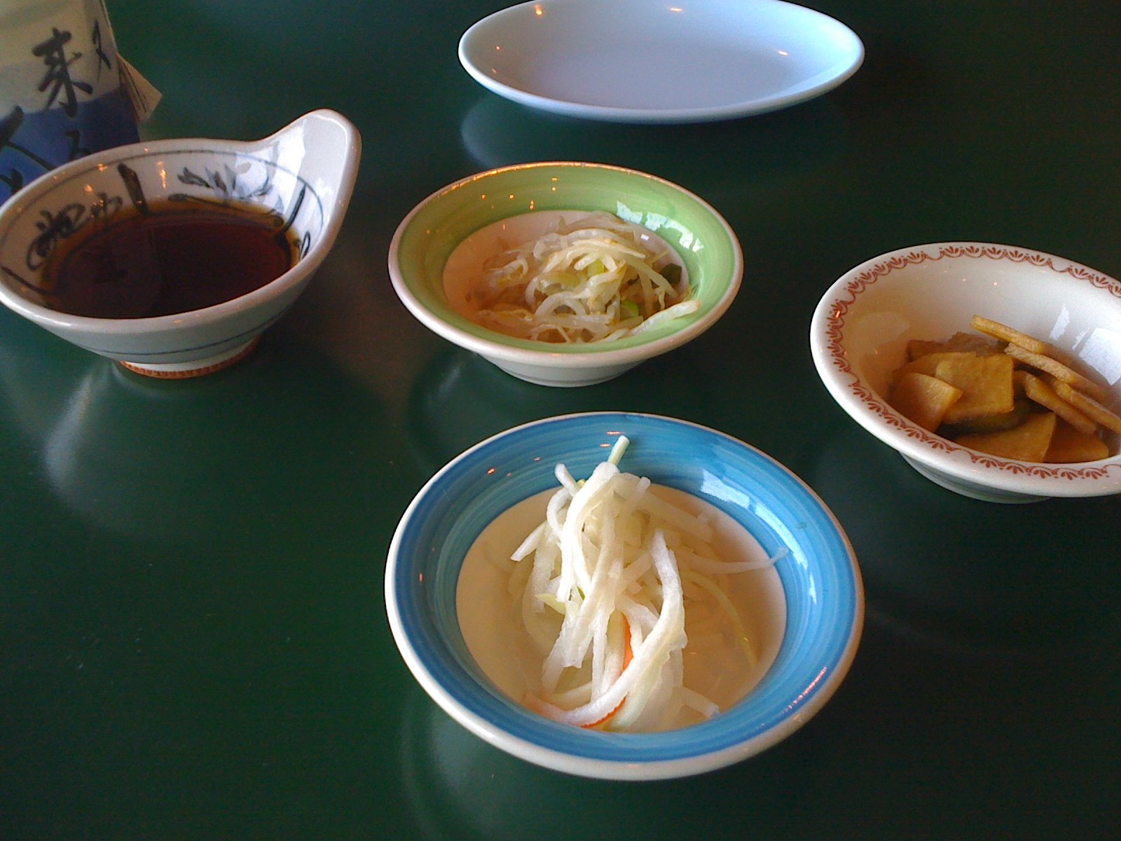 the mildest, shredded daikon in front. The bean sprouts in back had a nice red pepper kick. The bamboo on the right had jalapeño/green hot chiles. (The far left is the dipping sauce for our tempura appetizer).