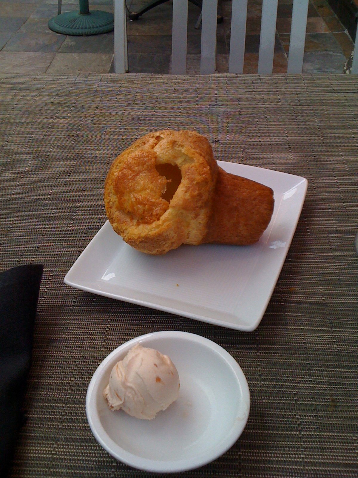 Another clue you are at Neiman Marcus: The man with the basket of still warm crispy flaky exterior, soft layered interior popovers (popovers!) and plate of strawberry butter stops at your table and places one on the plate which was on the table when you sat down. The butter is unsalted. The strawberry -with strawberry seeds- flavor is there, not too sweet, not overpowering. You know it is butter.
