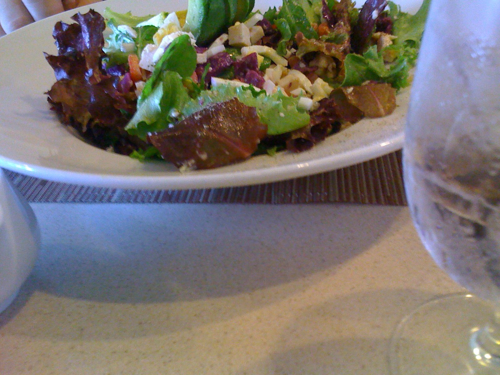 Here is a surreptitious photo of The Mister's NM Cobb salad ($16). Mixed spring greens, chicken, avocado, blue cheese, red cabbage, egg, tomato served already mixed with a warm bacon dressing. It was fresh and good, but not extraordinary. He also ordered hot coffee ($3.50), refilled constantly. It was very fresh, good and served with real cream. Of course.