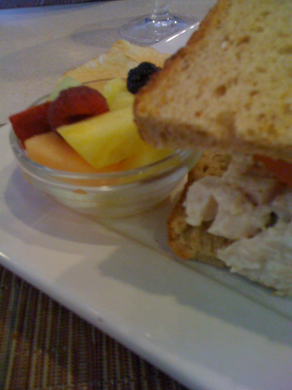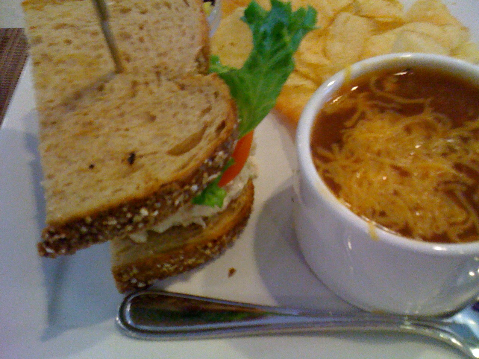 and a small ramekin of fruit (in this case, melon and pineapple and topped with a raspberry, blackberry and 1/4 of a strawberry). The sandwich- classic, simple chicken salad of fresh moist chicken breast and real mayonnaise, salt and white pepper. The bread is a hearty whole wheat with excellent flavor. The kettle chips are thick and crispy. The chili soup had ground beef, finely chopped onion and celery and small black beans, was soup and not chili, topped with cheddar cheese that was melty stringy in every spoonful. The fruit was amazingly flavored and ripe. Every piece.