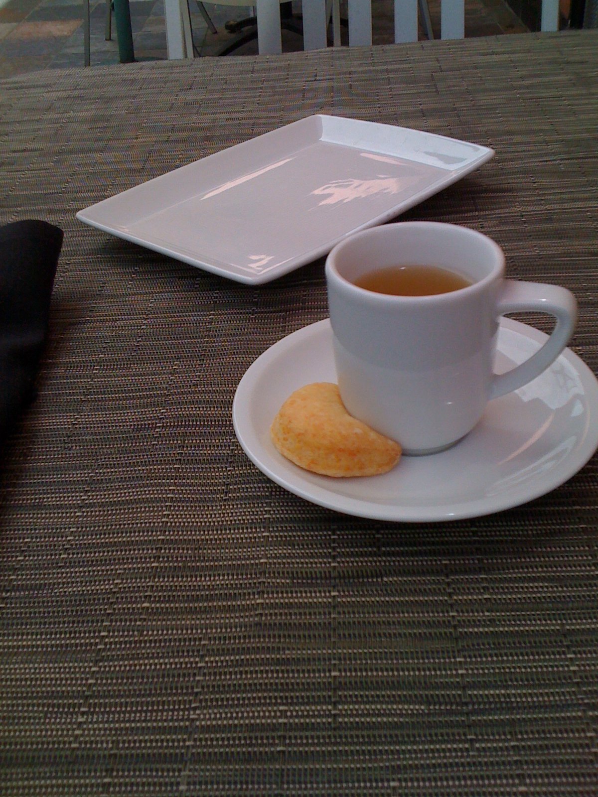 Almost immediately, an espresso size cup of perfect hot chicken consummè, sided by a fresh, small, soft cheese biscuit is placed before you. If you're female, the cloth napkin wrapping your silverware will be shaken open for you. Usually they try to match the color of the napkin with your clothing (dark or light).