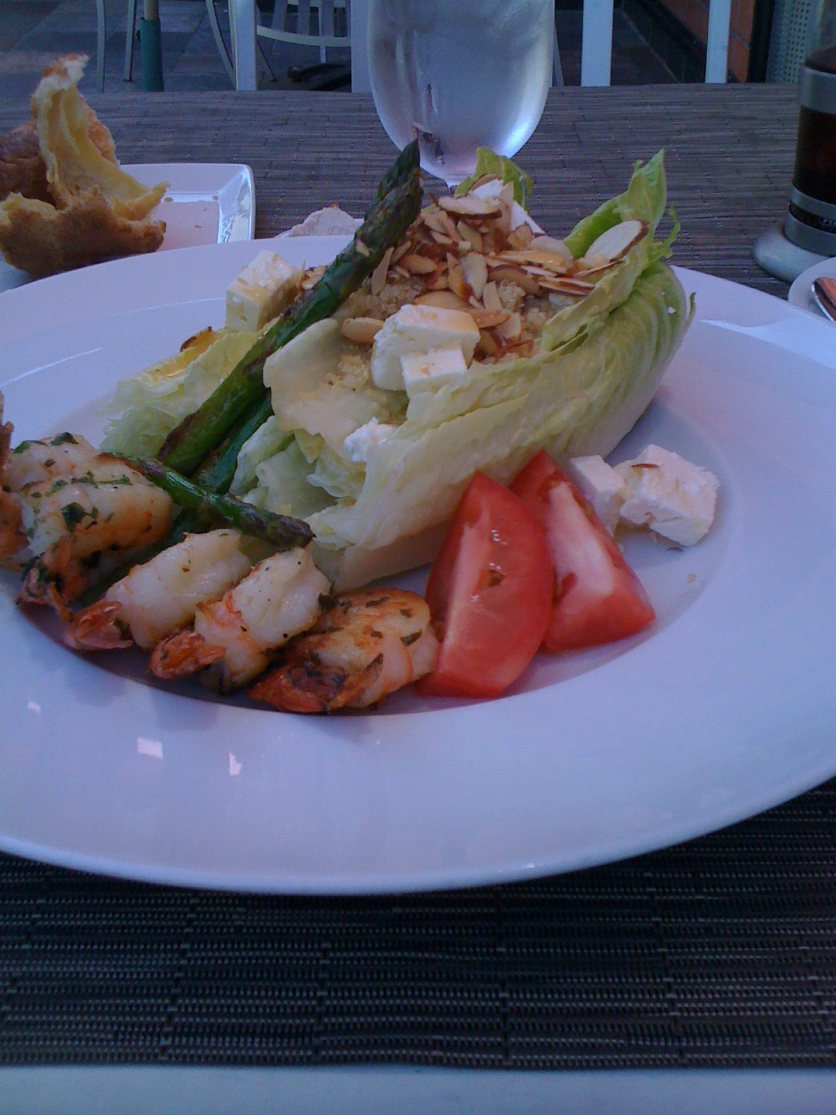 This. The "heart couture" lemon shrimp salad. $17. Two hearts of Romaine, quinoa, Feta, asparagus and toasted almonds topped with a citrus vinaigrette, sided by two very flavorful tomatoes and accompanied by five large citrus marinated plump grilled flavorful shrimp. No way would you think it was only 460 calories. No way would you think it was part of a 'healthy' menu. If everything labeled as being healthy tasted like this, I'd eat this way all the time. Everything in this salad, including the quinoa, was wonderously flavored.