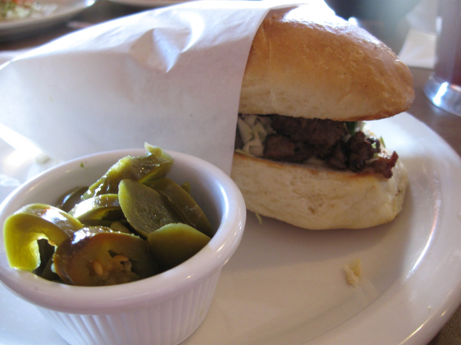 Chip opted for the asada torta and was very happy with the flavorful beef, the crispy grilled bolillo roll, and the numerous toppings including numerous slices of avocado on the sandwich and the pickled jalapeno slices on the side:IMG_2506
