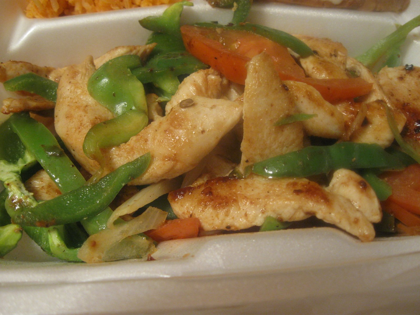In both cases, part of my problem is the rather dry chicken breast meat.  The burrito would have been 100% better if it had contained a generous portion of guacamole — of course, that preference probably reflects the two years I spent living in San Diego where the art of asada/asado burritos has been perfected. The chicken fajitas no doubt would've been better served on a hot platter in the restaurant, but the chicken breast just didn't have much flavor and the vegetables were not uniformly cooked.  Nonetheless, I can imagine that these chicken dishes might well be favorites of white meat chicken fans.