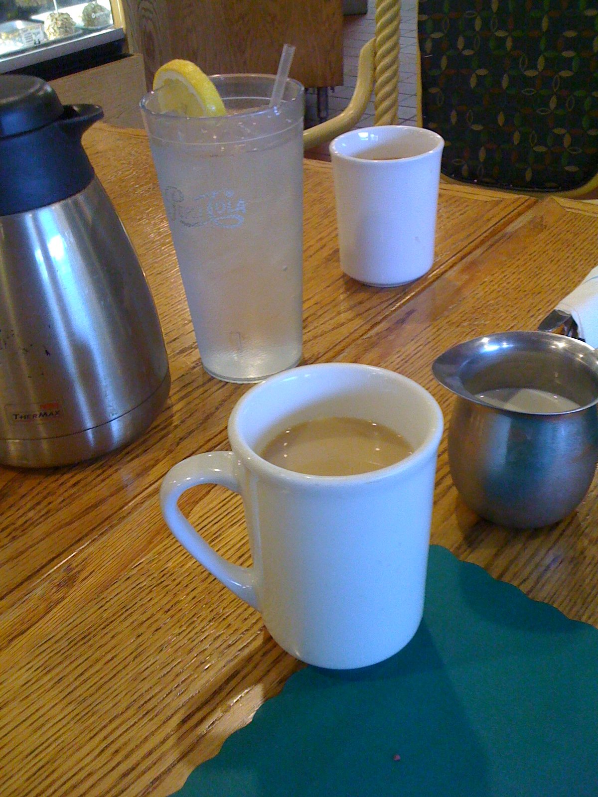 Coffee. $1.75.  Good, fresh coffee.  It is brought out in the cups *and* you get the small thermal pot on your table. Half and half in the small pitcher.  This would be perfect with a slice of fresh pie ($3) or one of the bear claws ($2), a cookie ($1.50) or even one of the chocolate/caramel/nut/Oreo™/Reeses™/M&M™ covered apples ($5).020