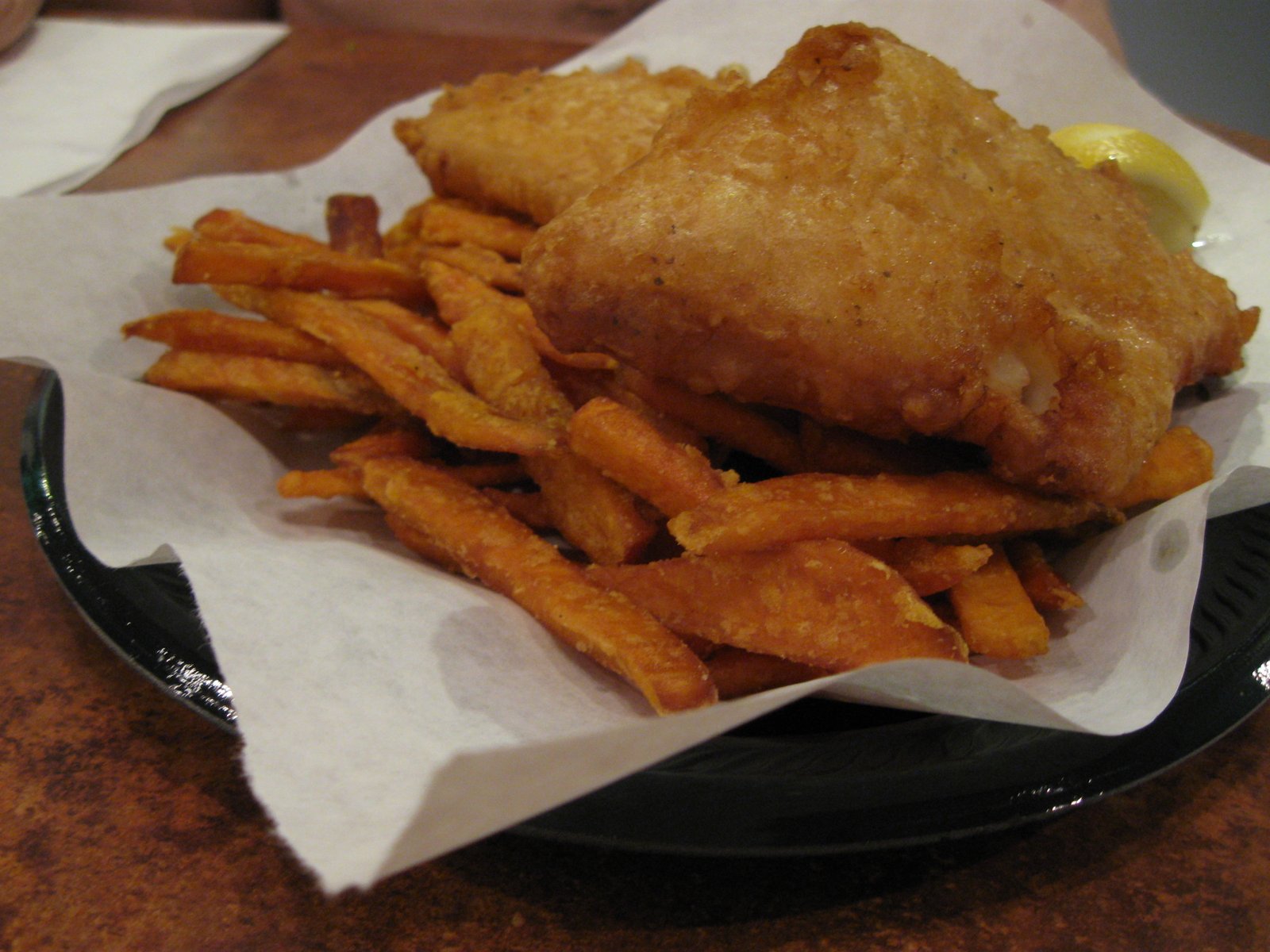 The two perflectly fried filets of Alaskan cod sit atop crunchy sweet potato fries, which are (imho) the best side available at the restaurant.