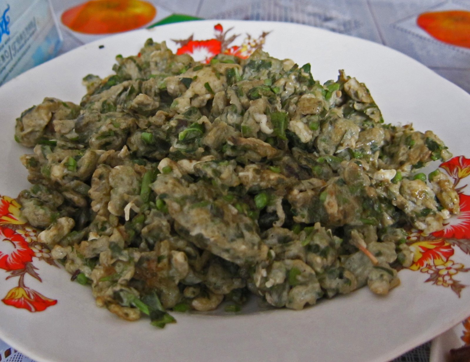 Looks sort of like eggs with leek, or perhaps scallion? Not quite right….. it is a classic preparation of scrambled eggs with Xiang Chun Ya, the young and tender shoots of the Chinese Toon or Chinese Mahogany Tree. The fragrance is unique, and the flavor is like a more herbaceous, mild garlic – leek….. that's about as far as I can go because there's nothing quite like it. It was a taste of the Missus's childhood, and something She greatly missed. And it is indeed very, very, tasty…….