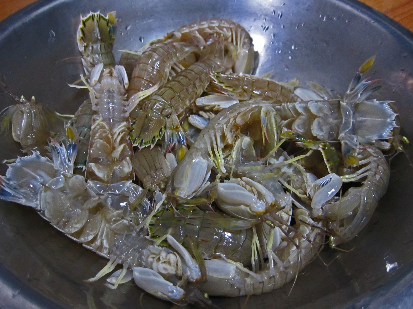 In the bowl were very, very, live and energetic Mantis Shrimp! I'd read about, and seen mantis shrimp on various shows, but had never had them. Let me tell you now, they are delicious….. The texture of the flesh is like lobster, but the flavor much sweeter and complex. Fifth Uncle, always the patient teacher, instructed me in the way of eating these. First, the flesh cannot be removed easily. So what you do is face the bottom of the shrimp toward you. Gripping the shrimp with your thumbs on the thorax and the other four fingers on the top shell, you gently flex up and down the segments until you hear a gentle "crack". You can then remove the top shell…. and gnaw the meat off the bottom shell, it feels primevil, but the flavor is fantastic.