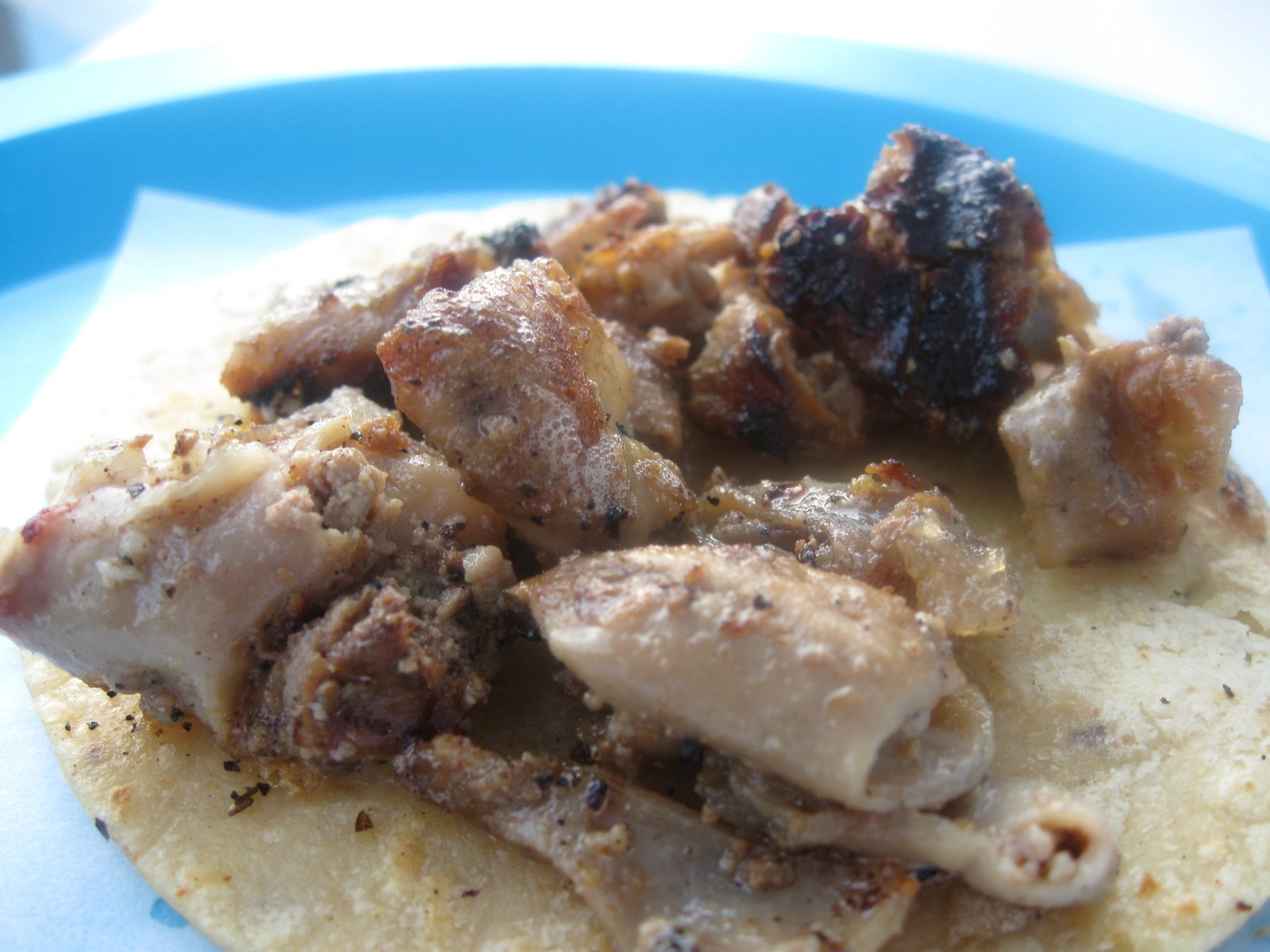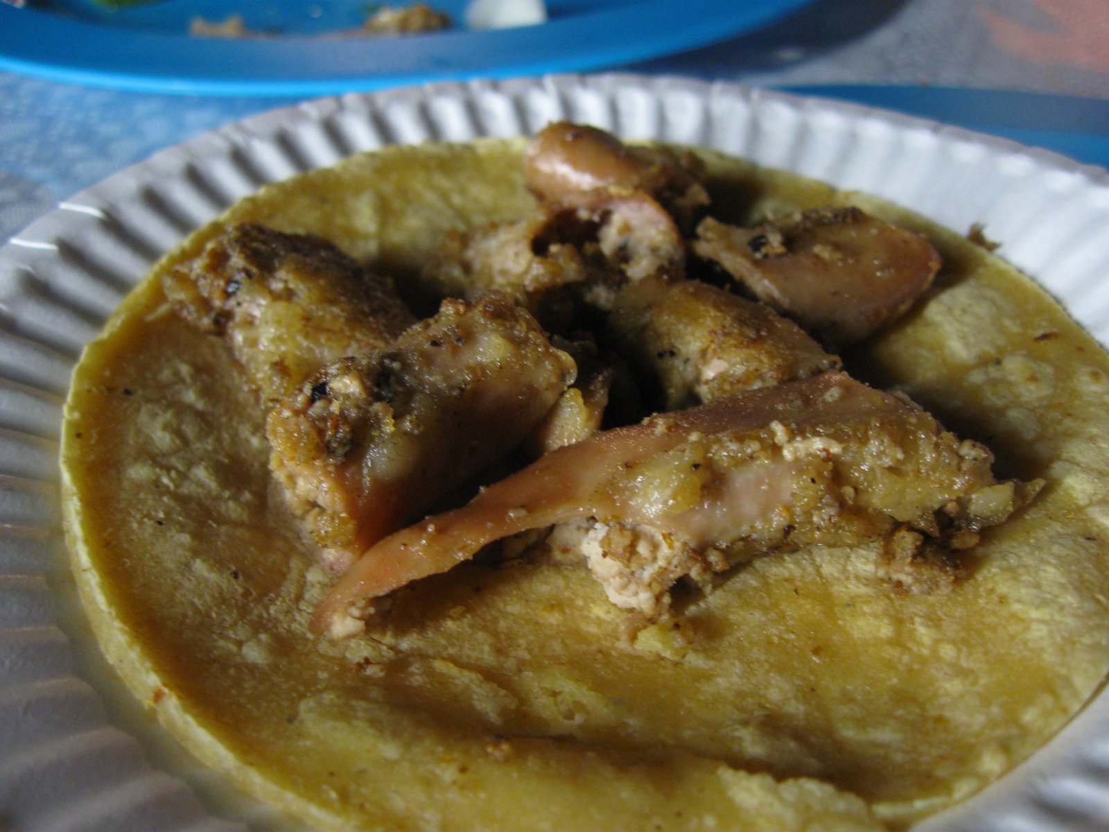 At that time, the stand had been doing business for only a few days, so we sampled some tacos that evening. The smooth and creamy chichirones was bathed in spicy red chili sauce: