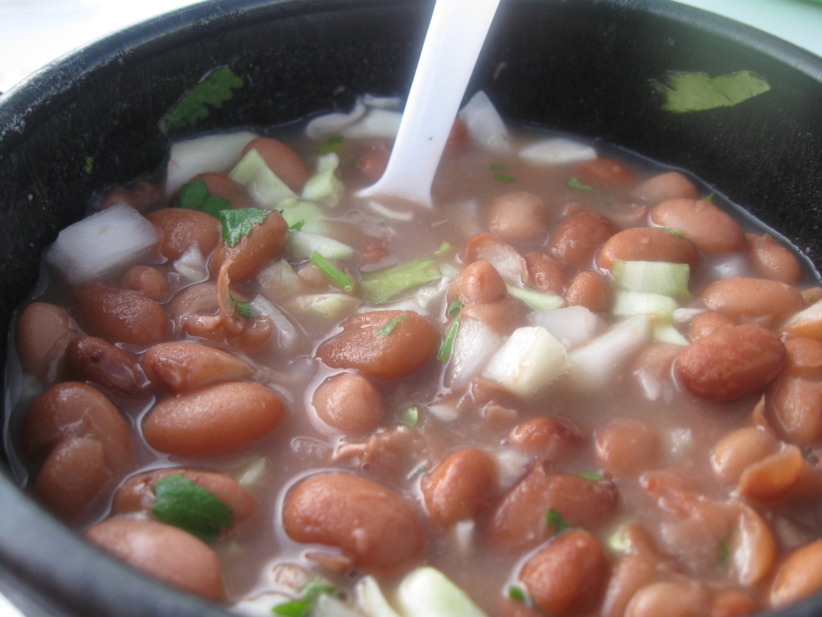 When you wait for your tacos to arrive, you're given little bowls of frijoles gratis, which I like to enhance with some of the free condiments: