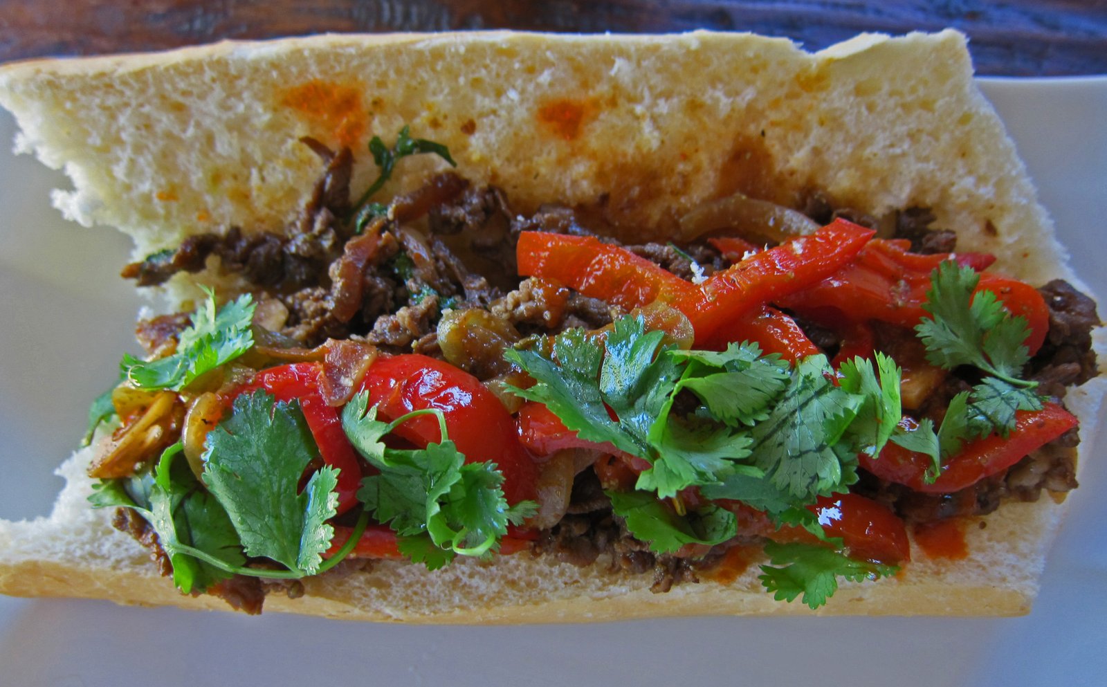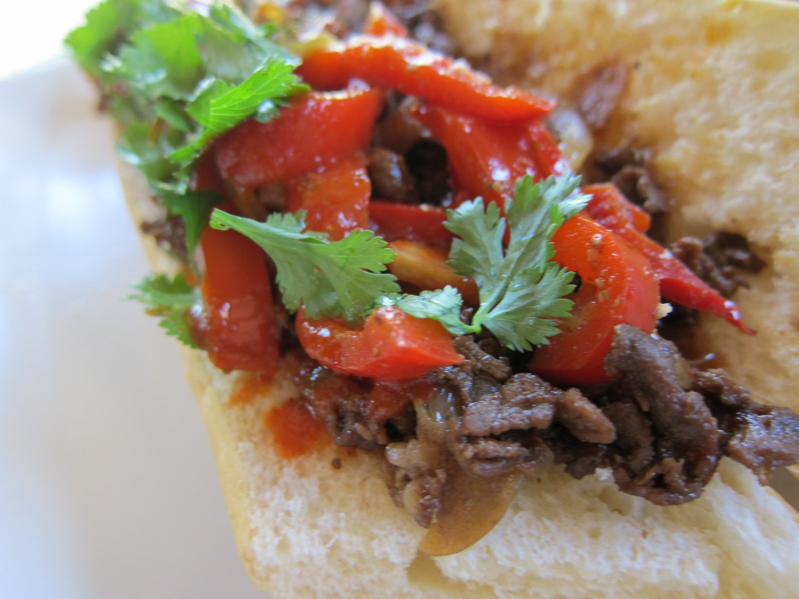 So I went back in and bought one of their Baguettes ($1.25). I sauteed some red bell peppers and onions with minced garlic, cumin, soy sauce, and salt, which added sweetness and a mild crunch. I topped it off with cilantro leaves and sriracha. I gotta say, this was pretty darn good. Next up, cumin lamb tacos anyone????