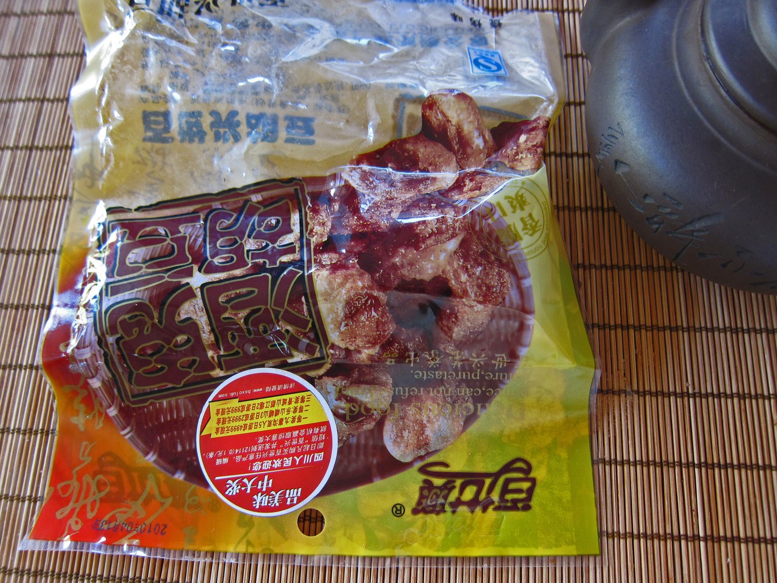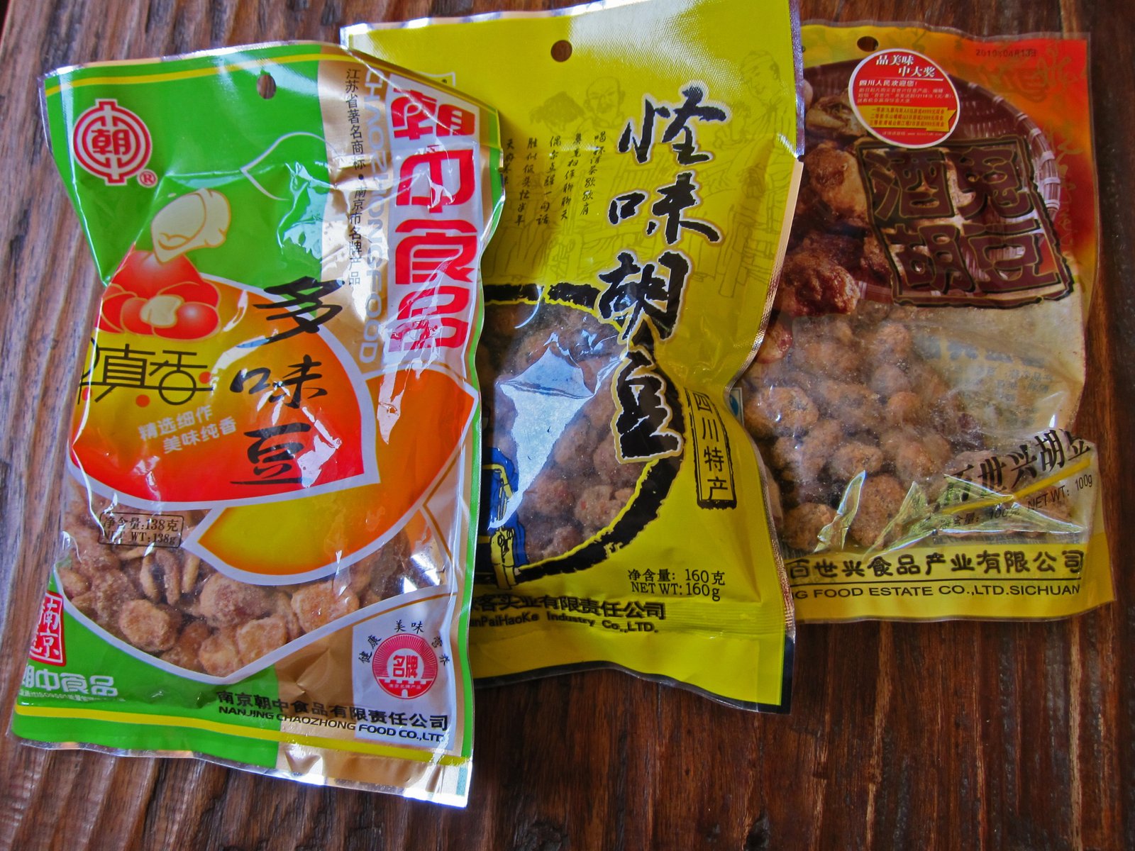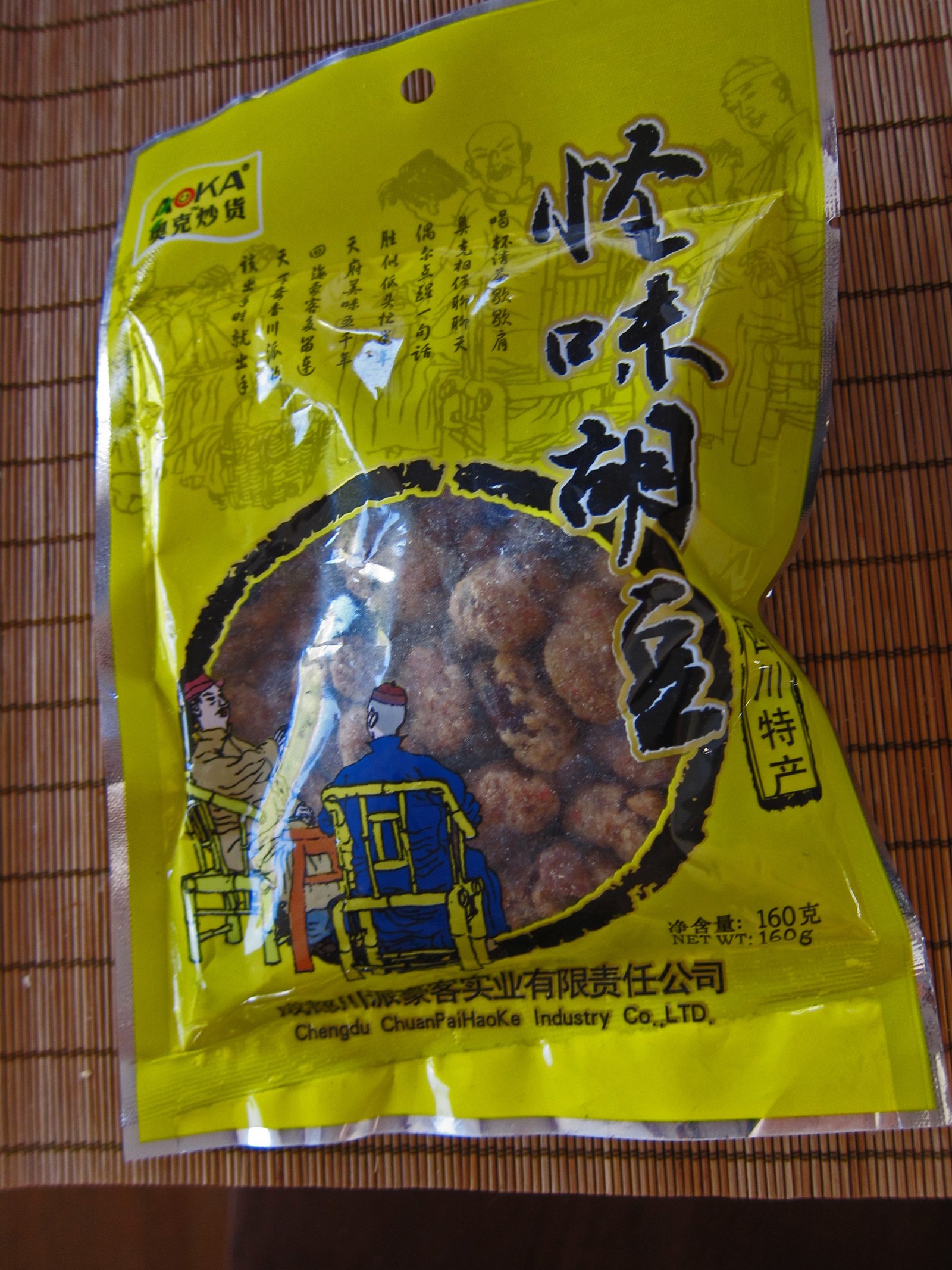 No, those aren't some turds laid on our dining room table by some strange insect…… it's my tri-weekly ration of Guai Wei Can Dou – strange flavored broad beans (or horse beans, or fava beans). For me this stuff is addicting…. the Missus has to lock these away.