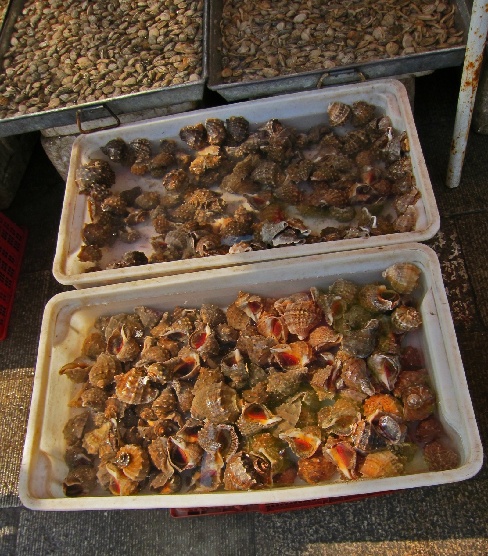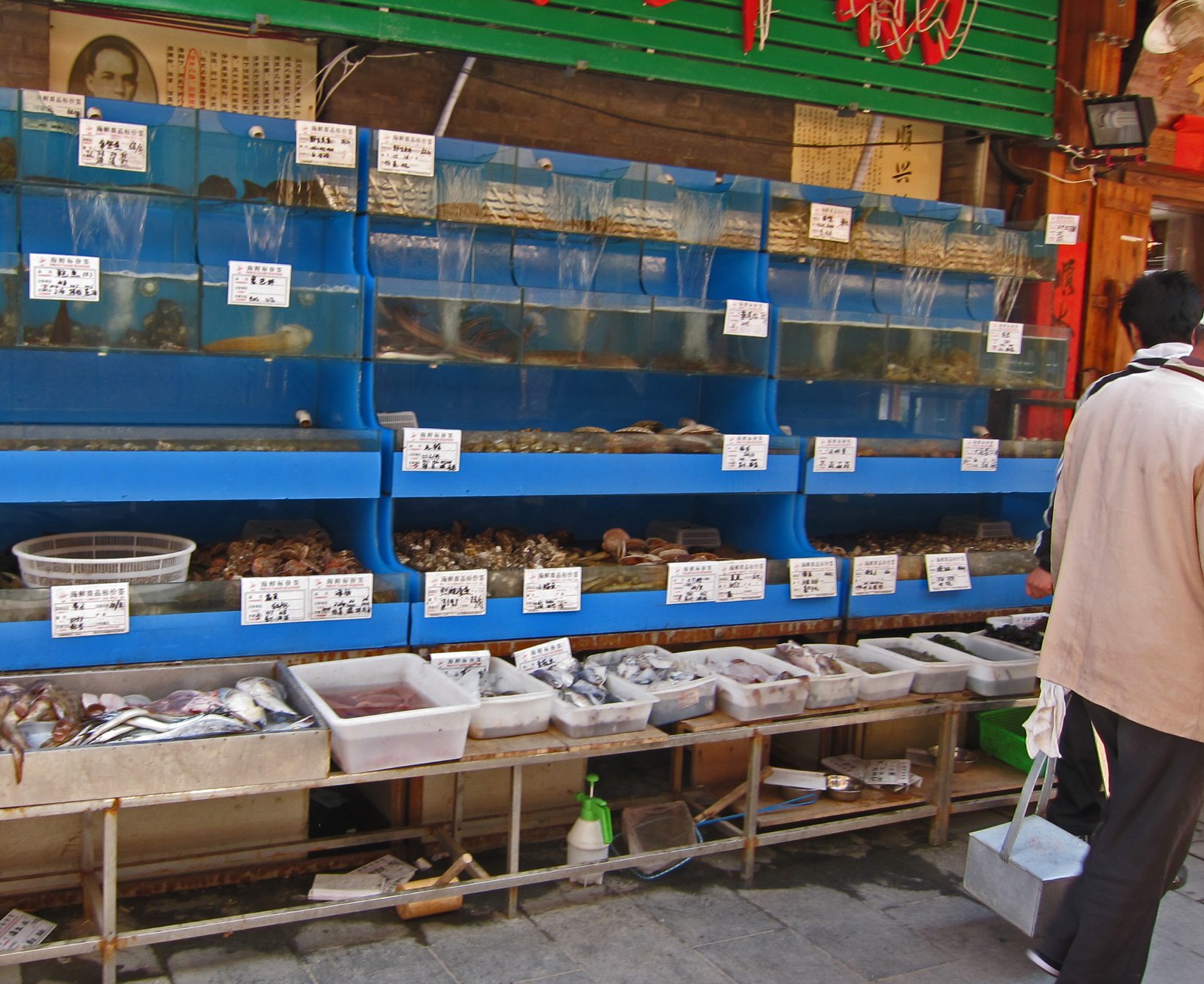 Walking around QingDao you just can't avoid the tanks and buckets of seafood. This one is at one end of Pi Chai Yuan, downtown QingDao's food street: