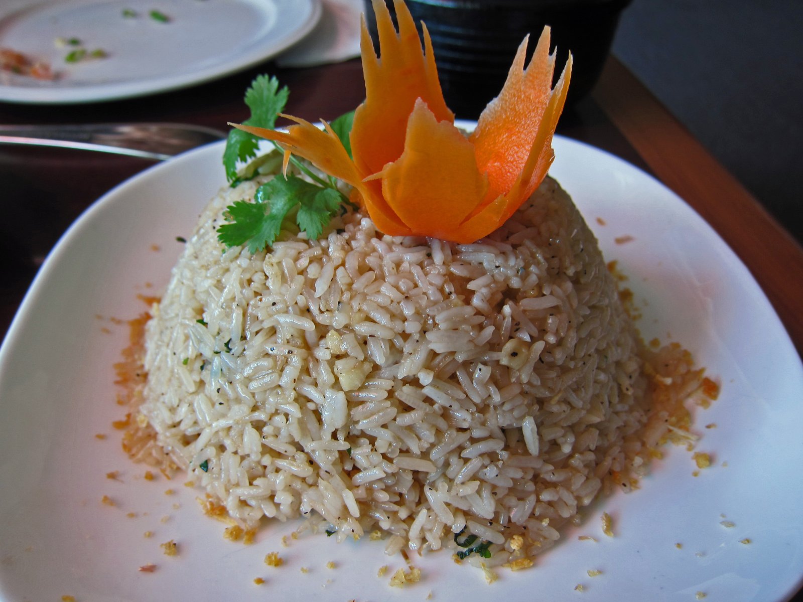 The Thai Basil is more finely chopped, which means the flavor is spread throughout the rice. More pepper is used, and even more garlic……