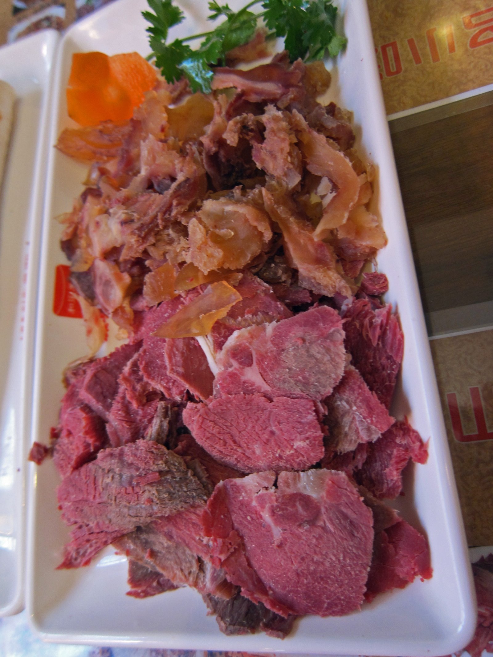 There's a famous saying; "tian shang long rou, di shang lu rou" (天上龙肉,地上驴肉上), translated as "dragon meat in heaven, donkey meat on earth." And as far as I'm concerned, you can have your dragon meat….. I'll take the slightly sweet, vermilion colored donkey meat. The meat can be pretty tough, and in this case it was a tad drier than what I had in Beijing, but I loved the flavor. The tendon also has a unique flavor, slightly more gamey then beef tendon.