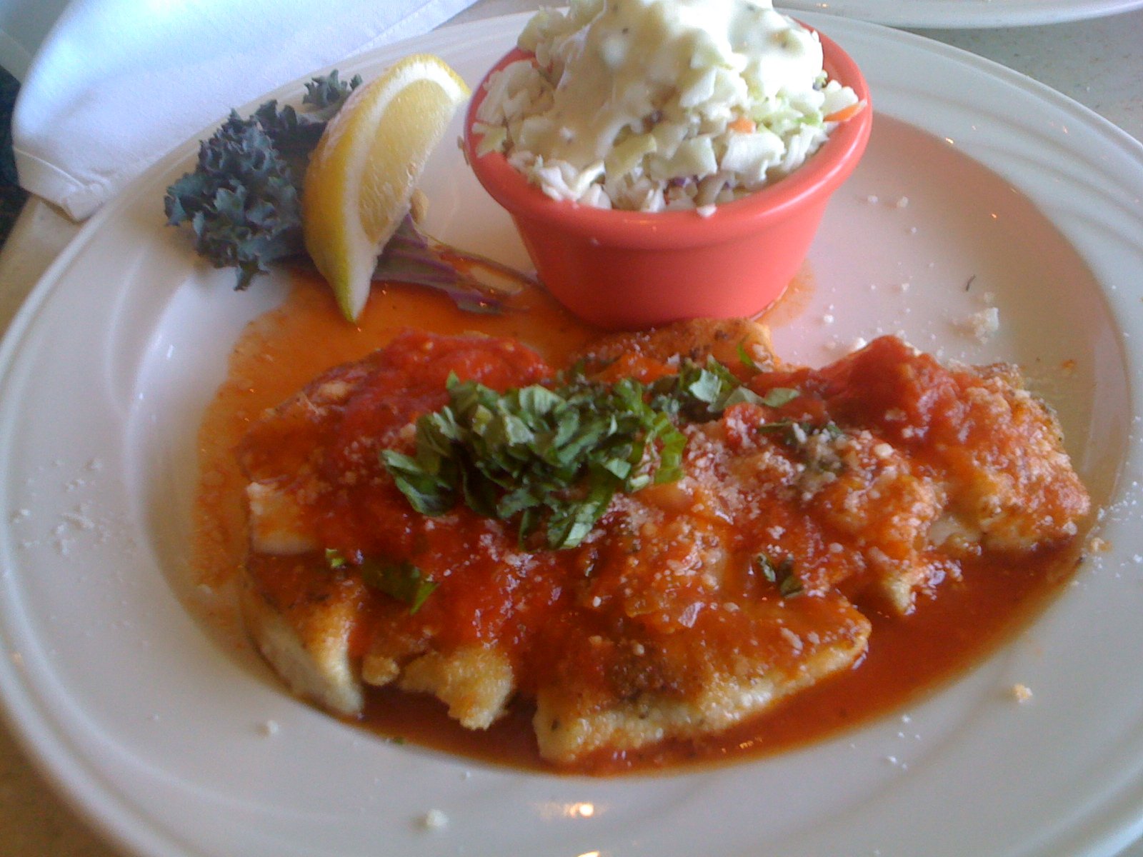 As my main, I chose the baked halibut with a house made milanese sauce-fresh tomatoes dominated, but the onion, garlic and white wine, along with the chopped basil mixed in made it a compliment for the moist pieces of fresh fish. I asked for the house made coleslaw with creamy pineapple dressing as my side-I crave this slaw.