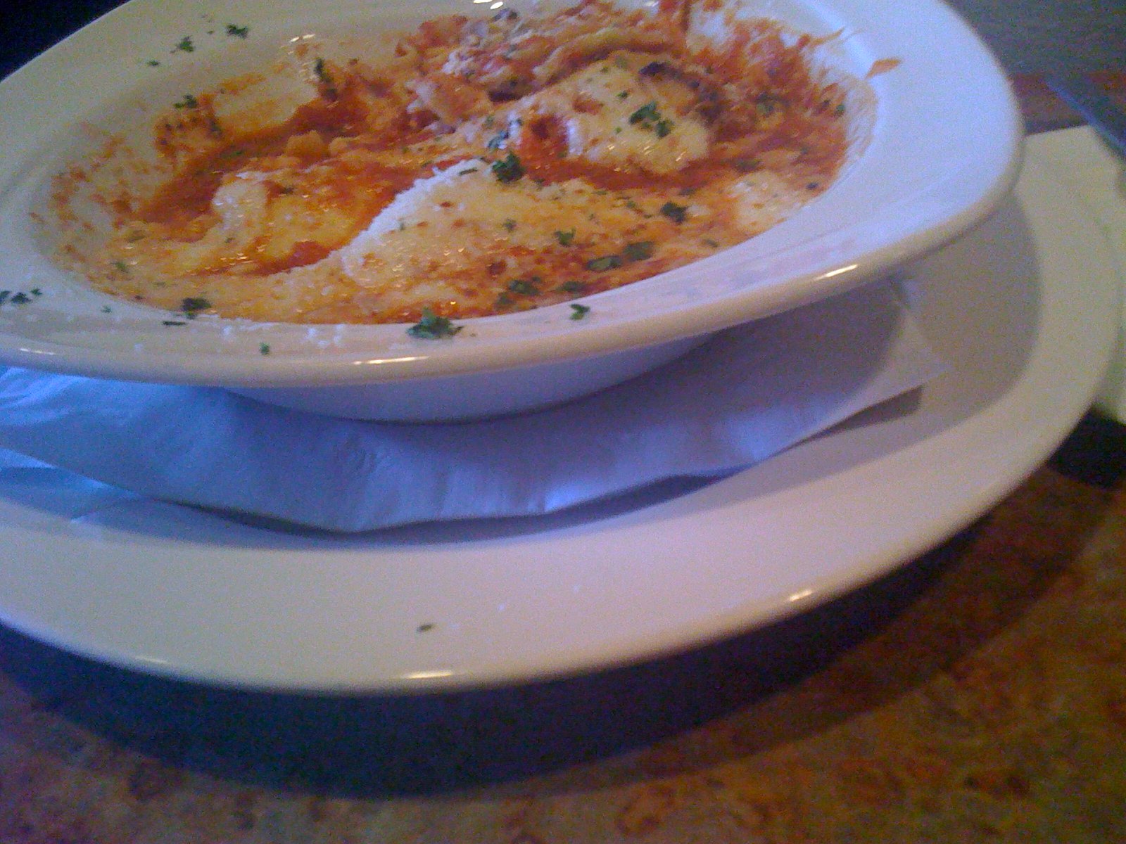 The Mister could not decide, but knew he wanted a baked pasta dish and chose the half ravioli half cheese manicotti with the marinara sauce ($14.99). The pastas were tender, house made. The manicotti were very much like crepes and filled with a combination of mozarella, ricotta and romano cheeses. The ravioli were large and overfilled. The marinara sauce, also house made, was very rich in tomato flavor and had just a touch of red pepper heat in it.