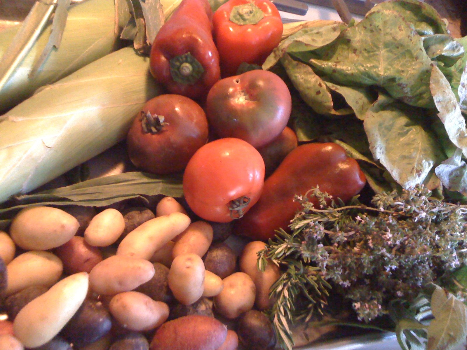 From the top left- two ears of white corn from Gloria Tamai Farms; four Lipstick peppers from Beylik Farms; five Heirloom tomatoes from Coastal Organics; Freckles lettuce form Coleman Farms; sage, rosemary and thyme from Rutiz Farms; a pound of mixed Pee Wee fingerling potatoes from Weiser Farms…but, there is more009