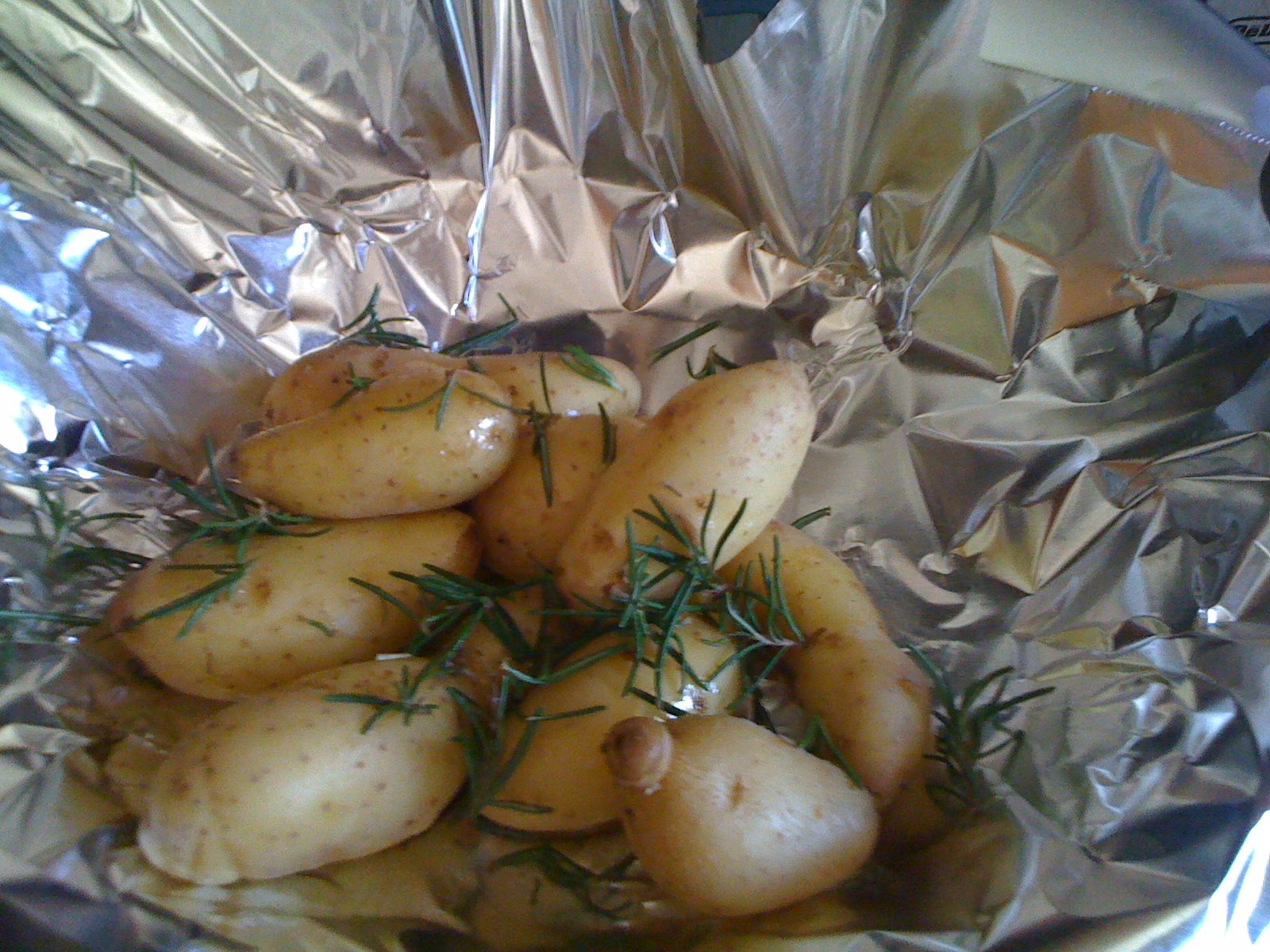 I took the largest fingerlings, tossed in olive oil and tore the leaves off of one of the sprigs of rosemary. I sealed the packet and put it on the grill to begin cooking while I prepared the fish. Pretty much steam from the oil will do the cooking.018