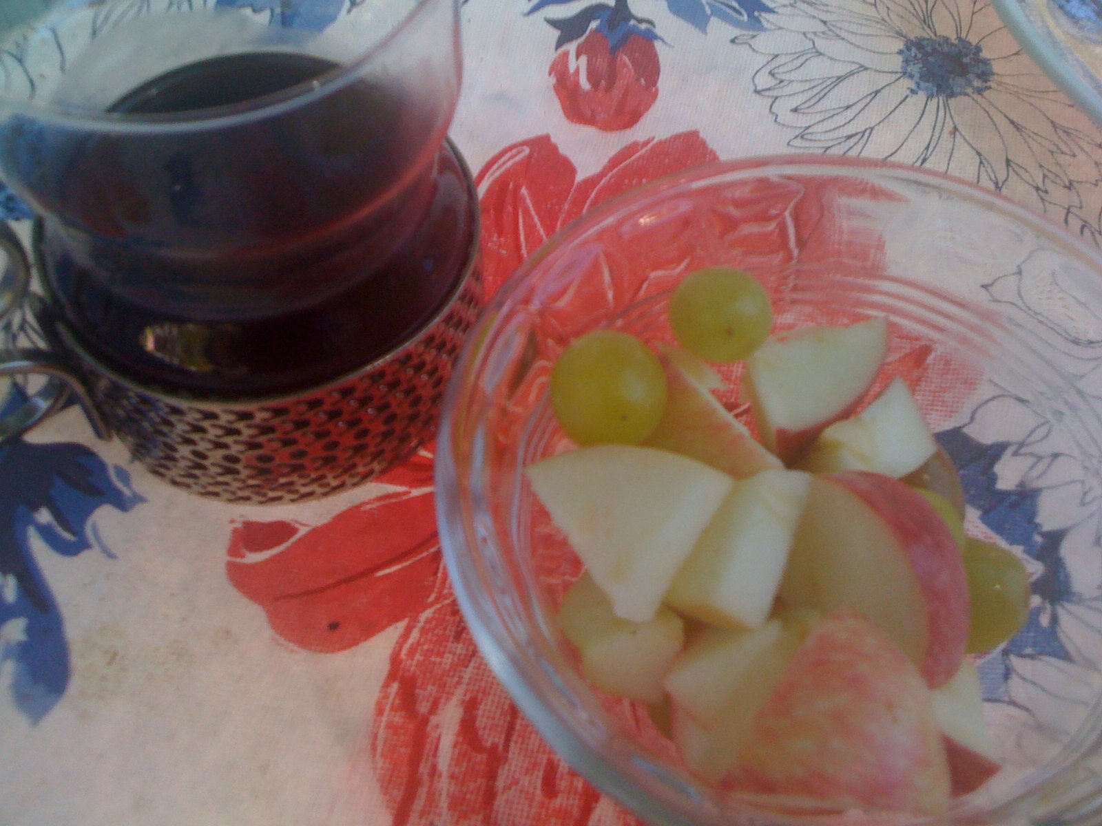 I chopped one of the New Jersey apples -grown in Paso Robles, but never seen anywhere but from Specialty Produce- and put it in a bowl with some grapes and had some coffee for dessert.  The apples have the most wonderful strawberry undertone scent and in the flavor…they are different and tart and I like tart apples.  They are also a bit softer in texture than a MacIntosh, my favorite. The Summer Muscat grapes are  sweet,  with a softness in texture. A  pleasant grape.  The two fruits did not really compliment each other and each could have stood on its own, but I don't want to finish anything without The Mister tasting it.001