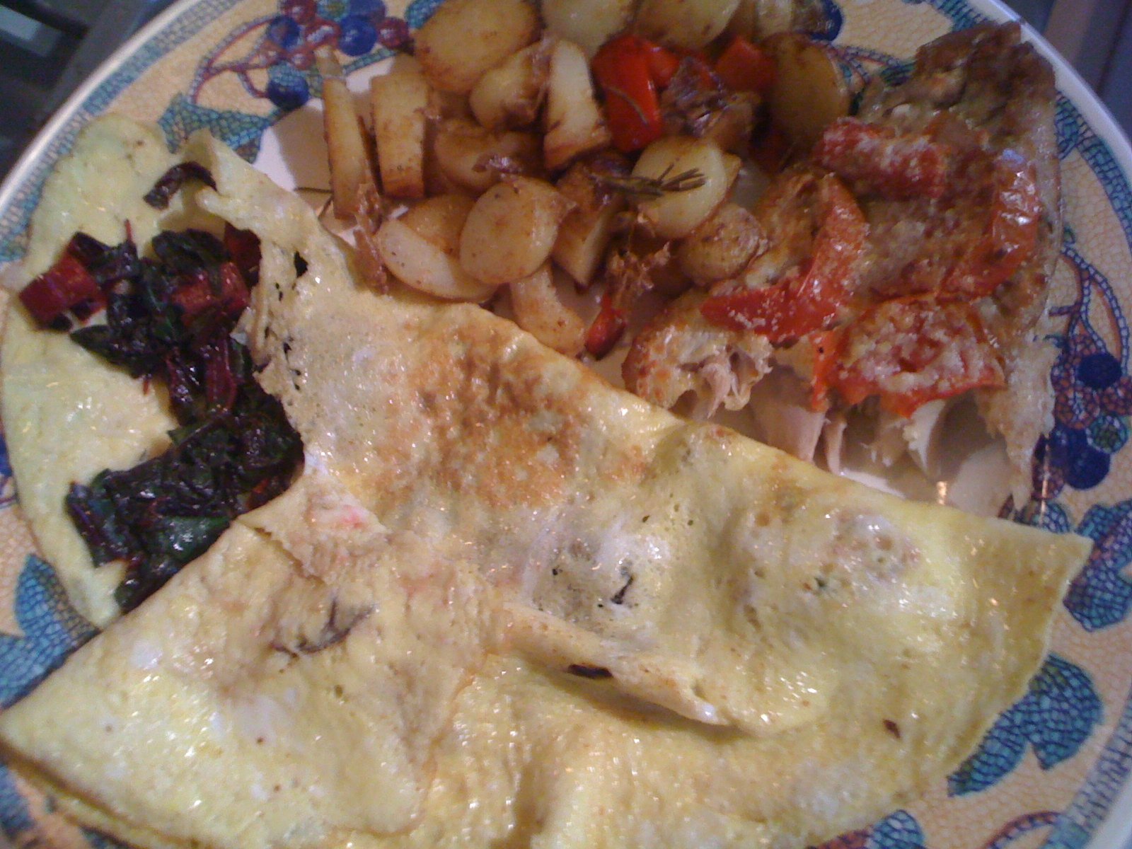 The Mister got home late Thursday night and everything needed to be reheated, so I took the already cooked fish, topped it with sliced Heirloom tomatoes and some Parmesan and put it under the broiler, just to get the cheese melted, sliced and sauteed the leftover potatoes with some of the red pepper and made a half assed omelete(i.e., an egg pancake instead of the proper fluffy goodness with crispy crust that is an omelette) and filled it with some fresh Mozzarella and sauteed Swiss chard bought on sale, from Henry's, this week.  A fresh, filling and tasty dinner.