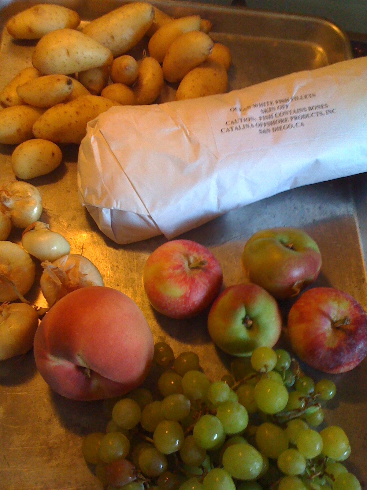 From the top left: another pound of all white fingerlings (a bit larger than the Pee Wees) from Weiser Farms; the optional seafood- this week two pounds of skinless ocean whitefish fillets from Catalina Offshore , one of a handful of places I buy seafood anymore; two New Jersey Apples from Windrose Farms;  two Goldmine nectarines and a White peach from Fitzgerald Farms; about a pound of Summer Muscat grapes from Murray family Farms and  six Cippolini onions from McGrath Farms.  So, $32.  (The bag is $20 and the optional seafood is $12)and I am going to make three preparations of the fish (one fish fillet per prep, but some will turn into two meals). 016