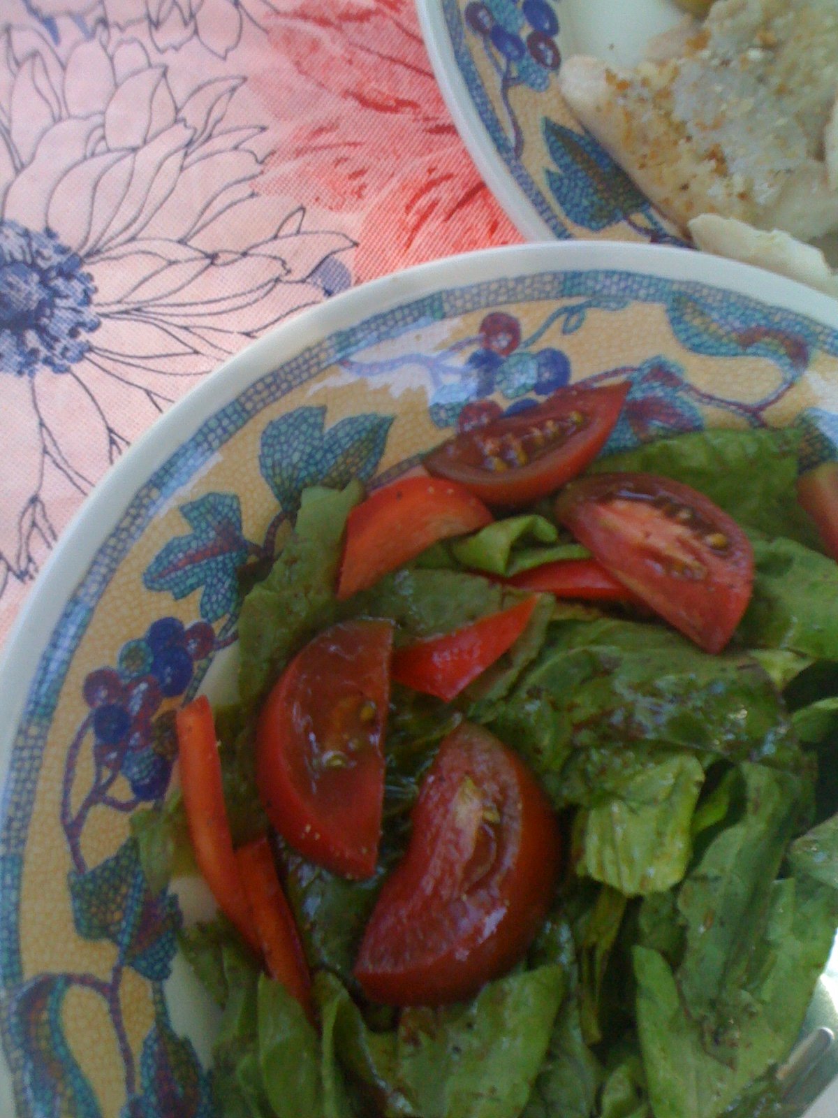 I made a salad with about half the head of the Freckles lettuce, a Lipstick pepper and one heirloom tomato, topped with olive oil and balsamic.  The tomatoes are so very sweet, the red pepper is pretty much a red pepper and the lettuce has the texture of Romaine but is more delicate tasting, like a red leaf lettuce. 028