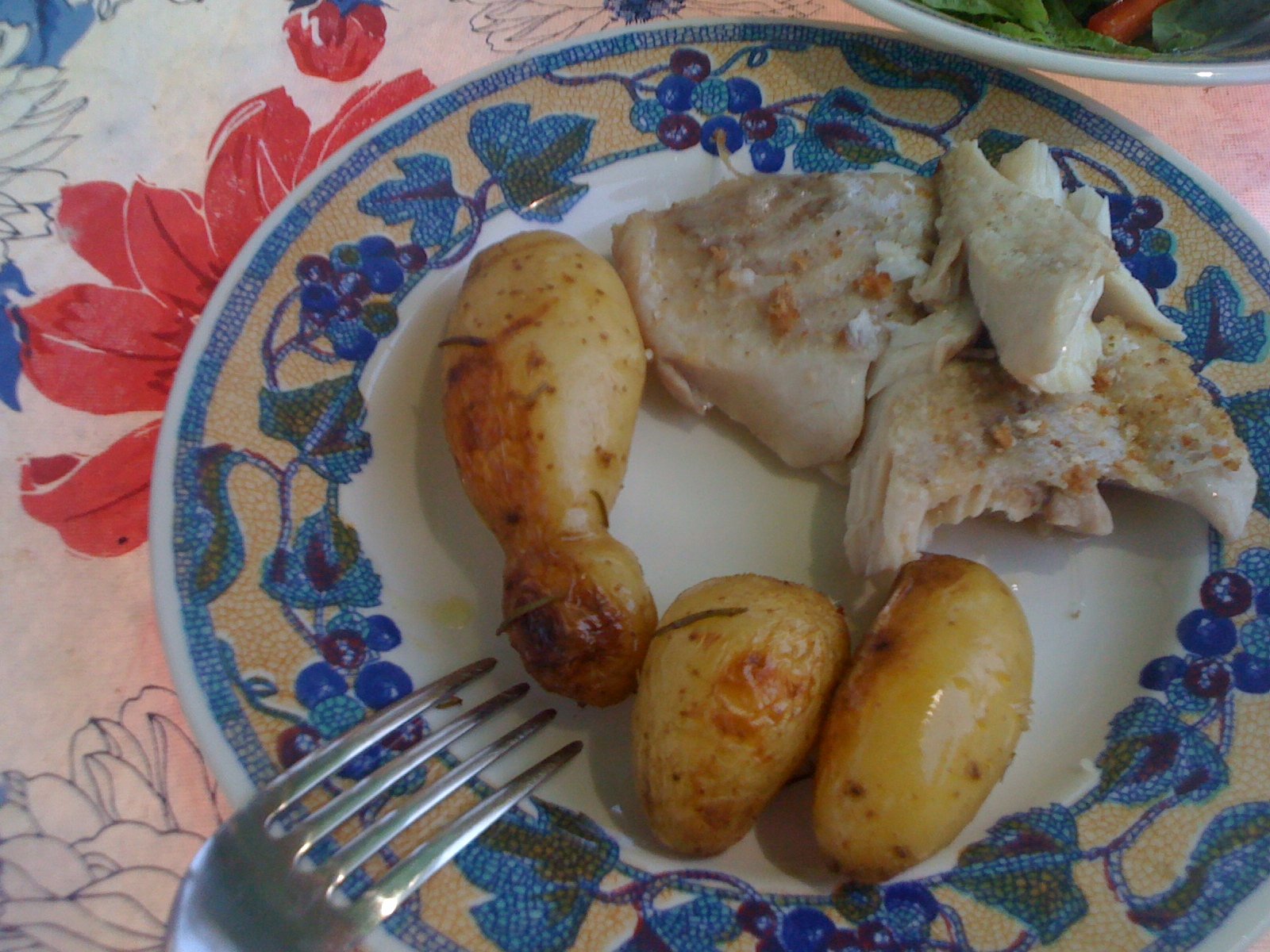 The potatoes still got cooked to a lovely brown crispiness on the bottom, taste so perfectly sweet and the fish just needed the six minutes on the grill.  The fish was so perfectly sweet in flavor.  I hope the rest of the fillet will be there for The Mister's dinner…038