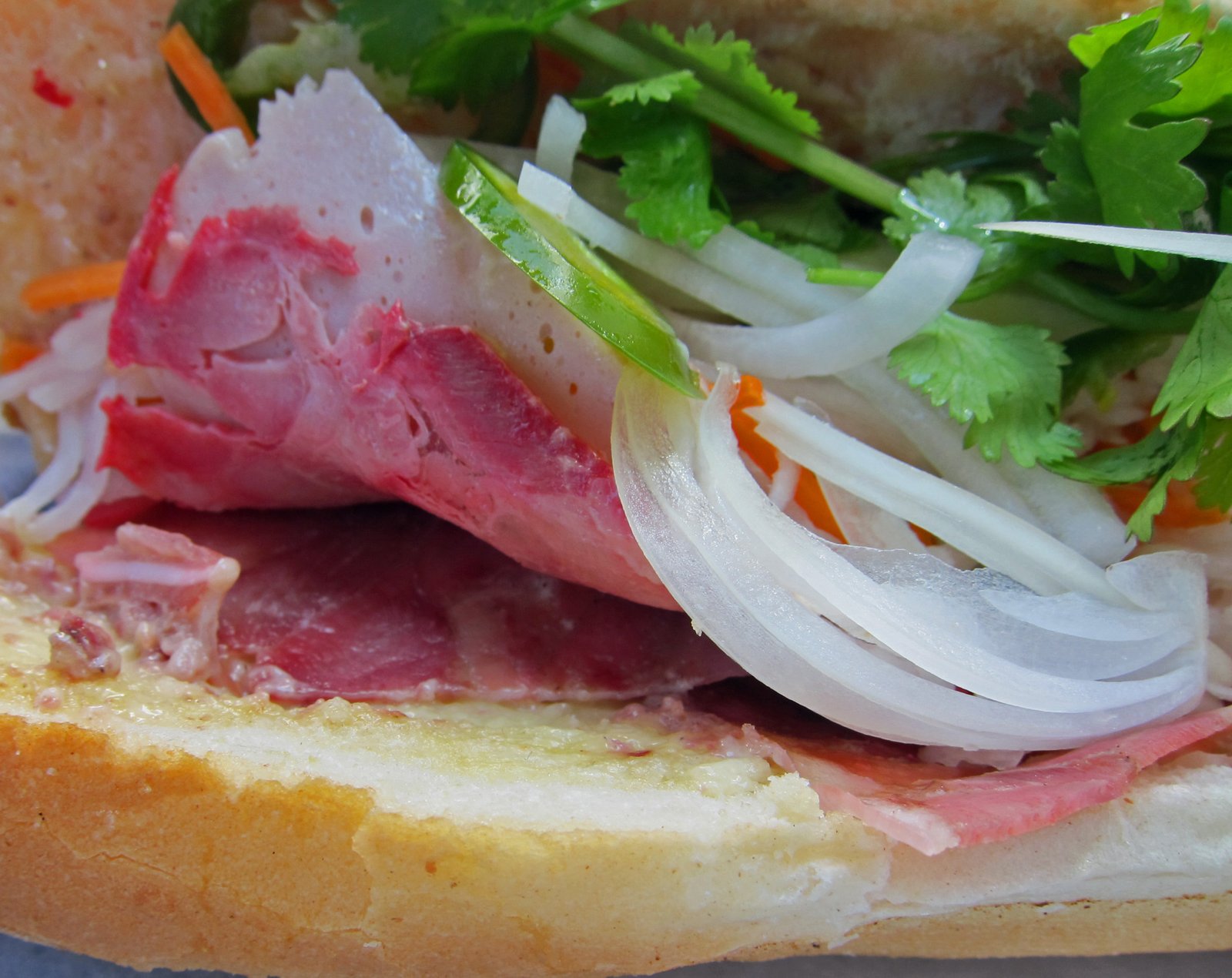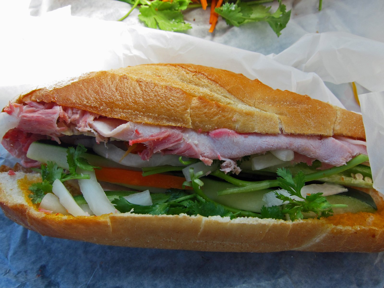 Not surprising was the fact that this Banh Mi had the least amount of meat, which are cut in thin slices. What most surprised me was that I enjoyed this Banh Mi the best out of the three. If all remains the same, I believe the bread is from Le Chef Bakery. It was toasted fairly well. Initially, I thought there was too much "spread" on the sandwich, but it was a decent amount. The jalapenos weren't overpowering, and the pickled veggies had a nice crunch in addition to a good sweet-vinegary flavor.