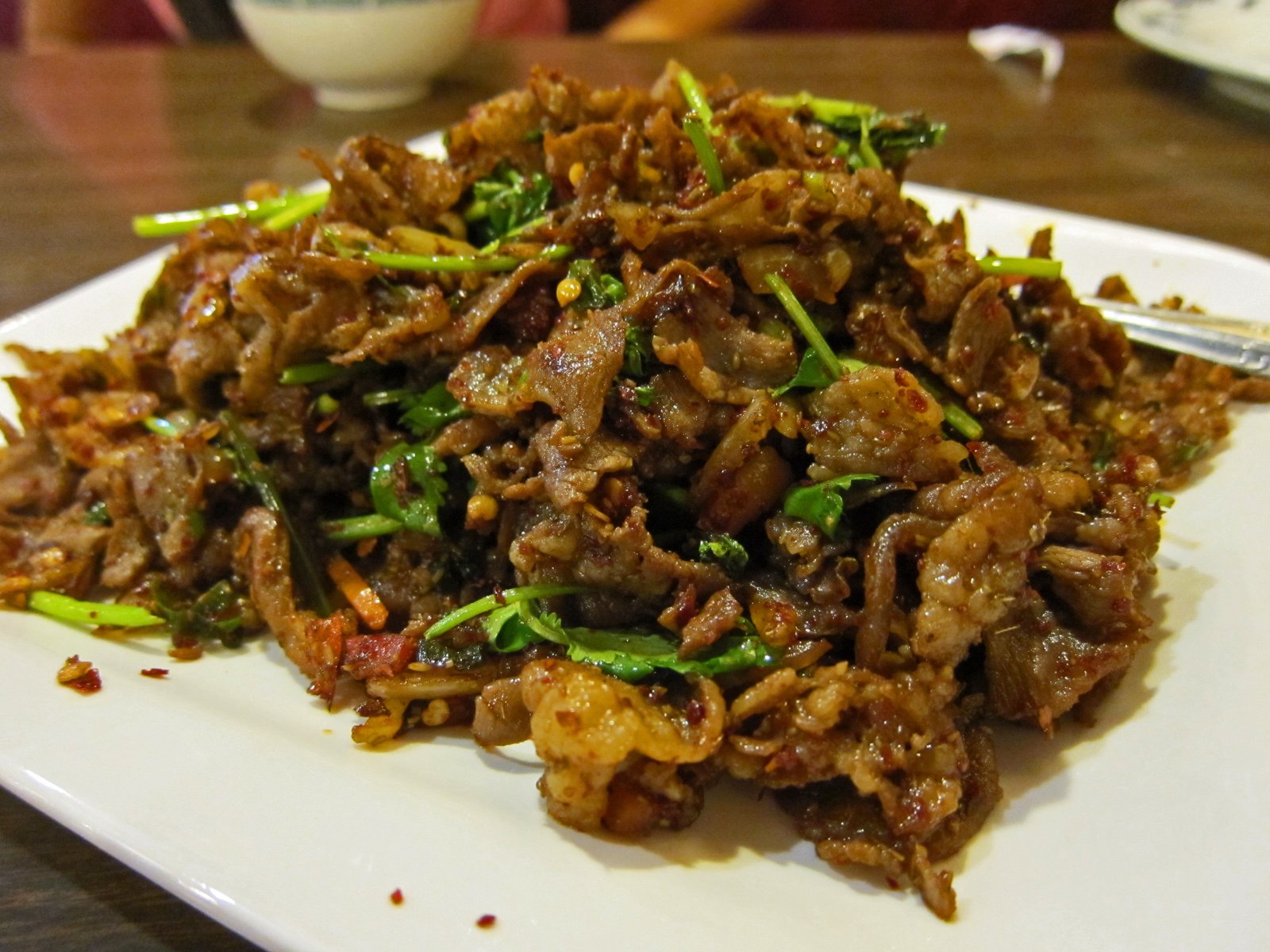 Think of it as being about the same as the Cumin Lamb, with the cumin replaced by some chilies. Actually, this dish wasn't very spicy. It was pretty good overall.