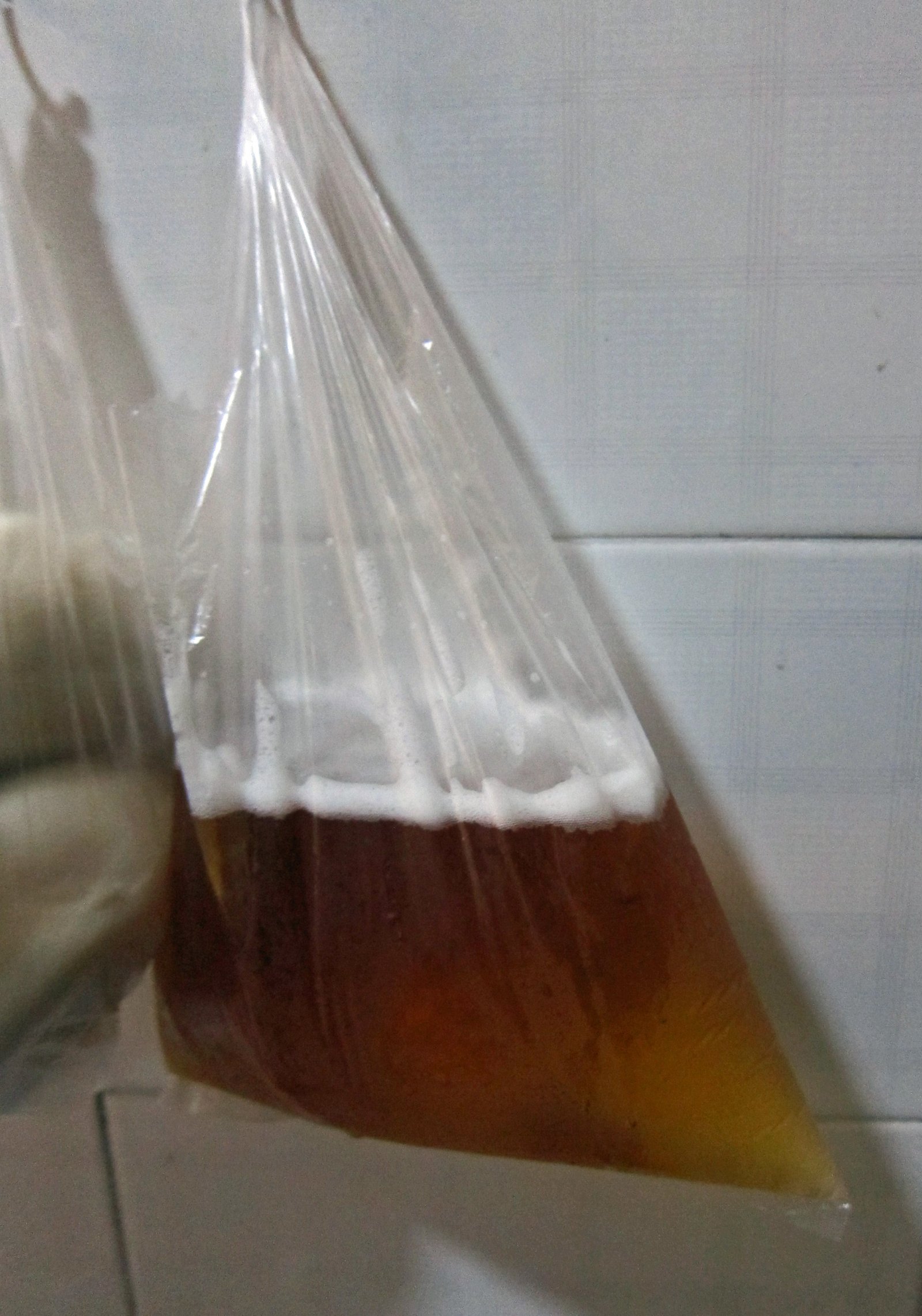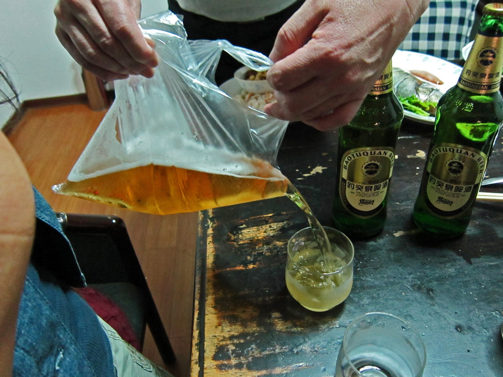 If you've ever wondered what those nails pounded into the side of tables are for……. well, it's there to hang your bag of beer of course! And the Missus's Uncles are pros at pouring beer from a bag into a glass.