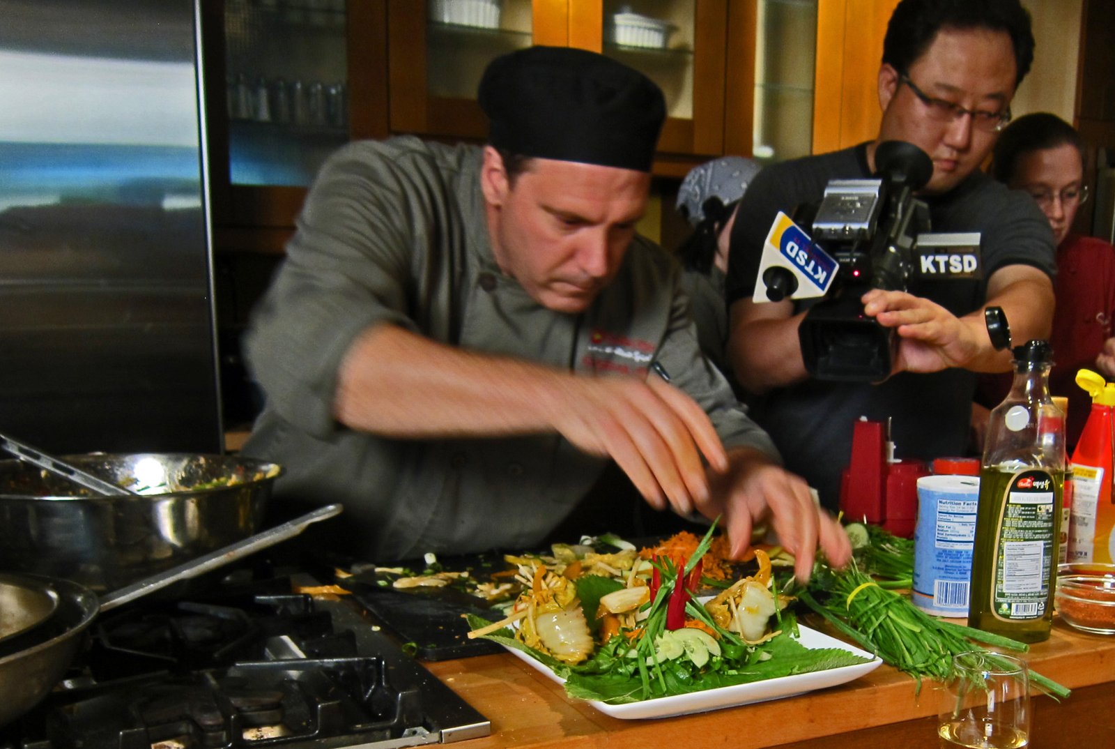 Chef Lance, who had the task of making KimChi, used a quick saute with garlic and oter seasonings to get his Kimchi started. He also added bell peppers, utilized the freezer to bring everything to temp, and a creative presentation to complete his dish.