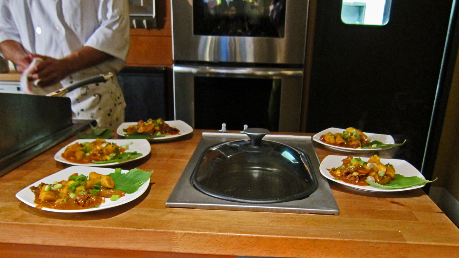 Next up were Chef Maria Sparks, co-owner of Cork and Platter, and Rene Fernandez. Chef Maria had Dak Galbi, and had no idea what that was! Still she was a very good sport, and seemed to have fun with the dish.