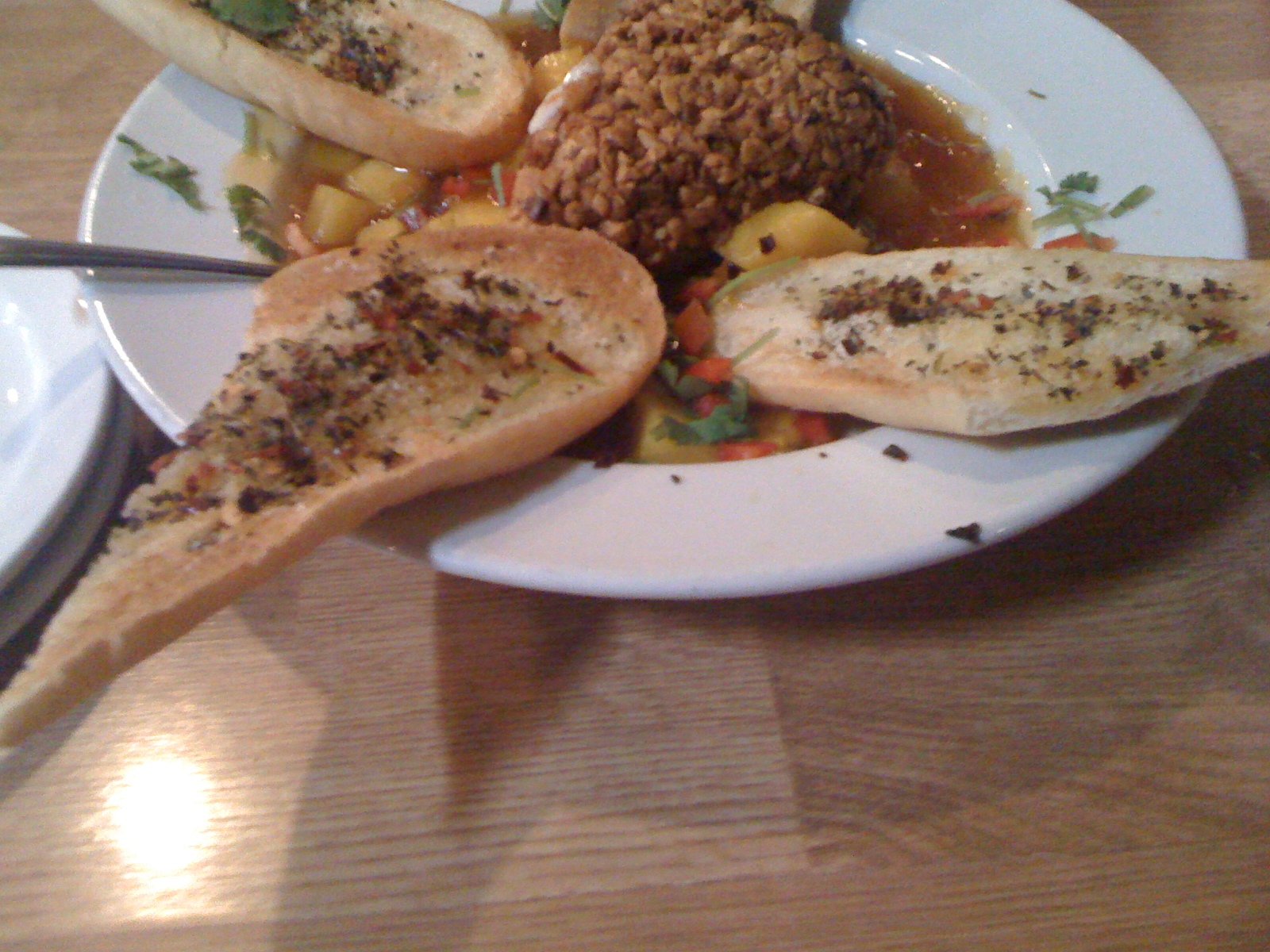 Nut crusted brie, served with an apricot and mango chutney (lots of red peppers and cilantro) and olive oil herbed crusty baguette is regular $8.50, but $3 off all appetizers during College football games.