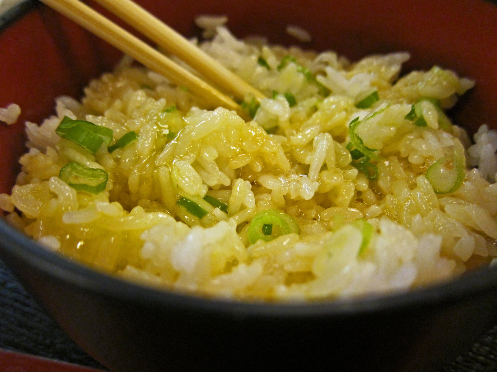 Pour over hot rice (in all honesty, the rice should have been hotter) steal some green onions from my tofu, and mix…….