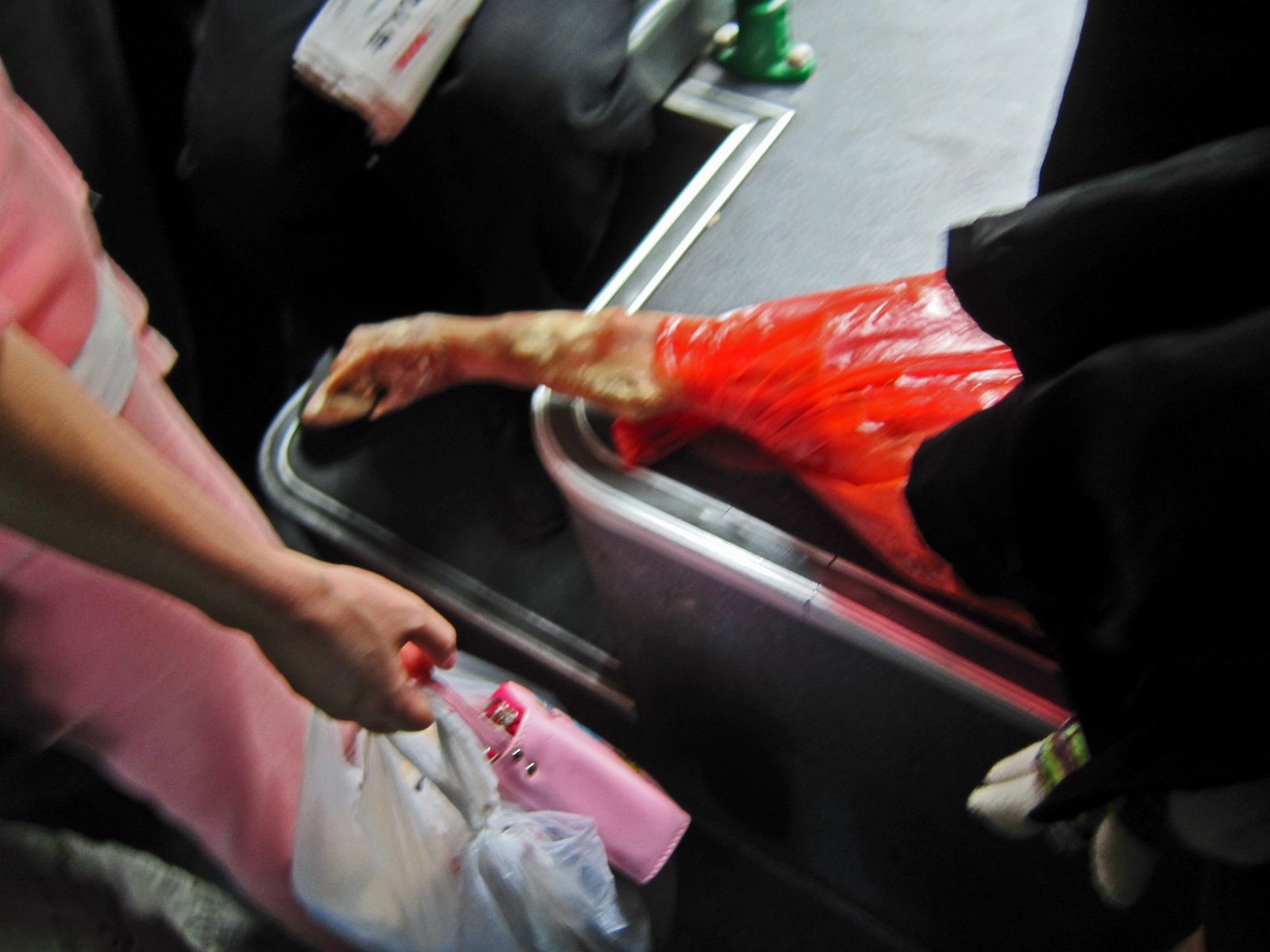 After doing some shopping, and buying a couple of gifts, we got back on the bus. The Missus pointed out a gentleman who had an entire Jinhua Ham lying on the console behind the driver……