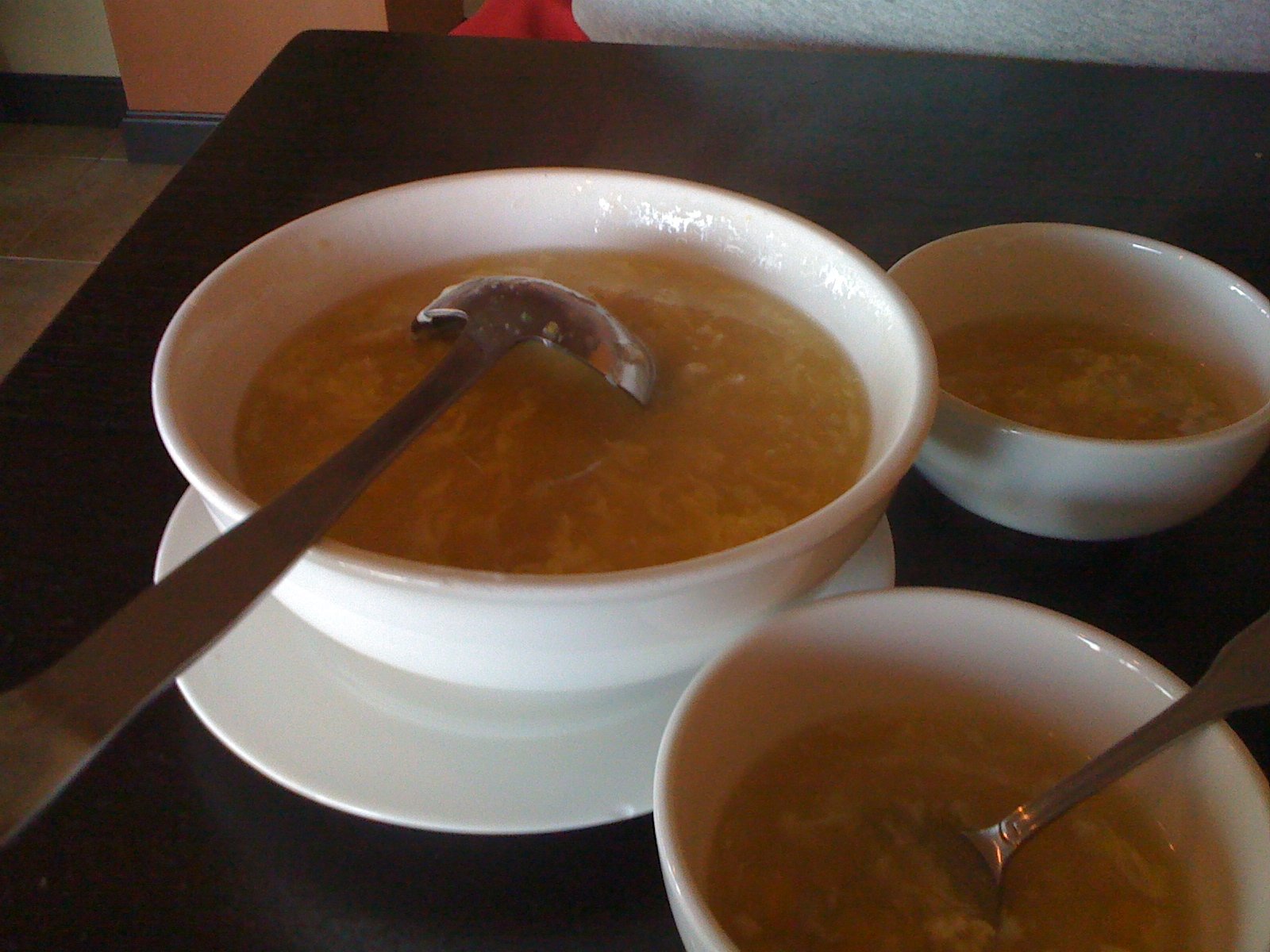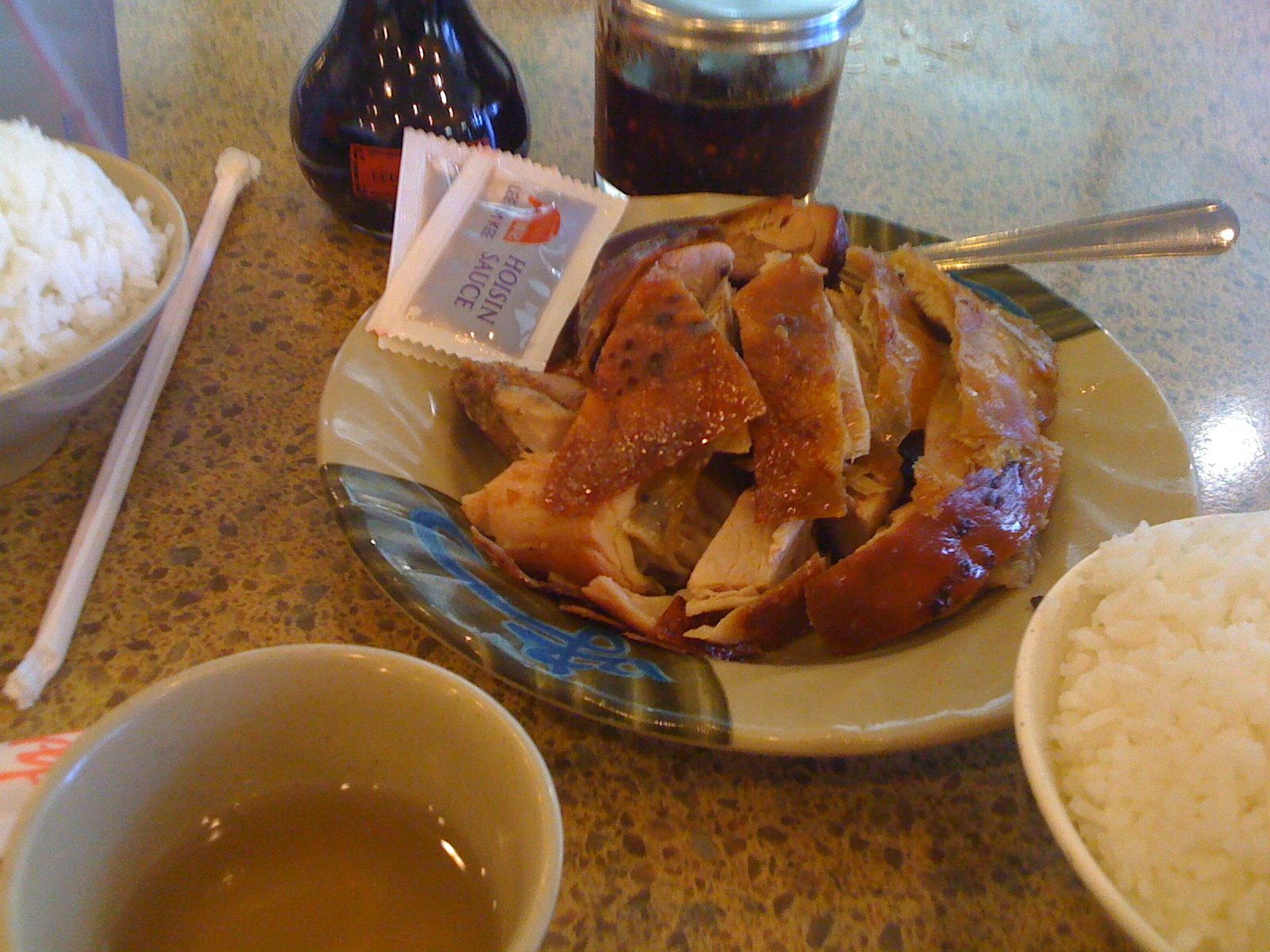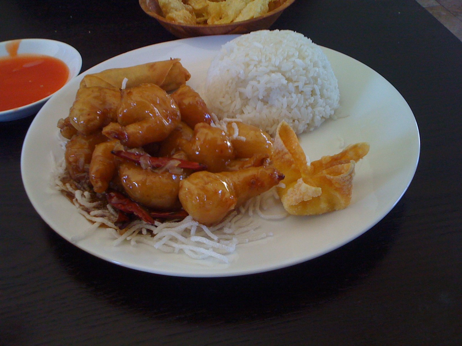 A bowl of fresh fried crunchy bits and plate of 'dipping sauce' are brought out to your table. But those are fresh fried crunchy bits and the sauce is somehow not too sweet and has some vinegar-y tartness and is quite pleasant.