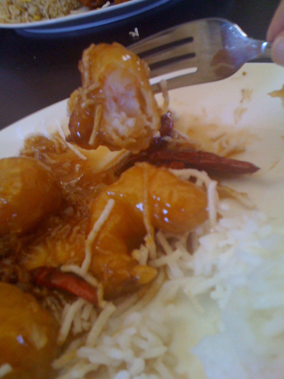 The spicy honey shrimp lunch special ($5.95) includes rice, egg roll, cheese wonton and this -light, crispy, fluffy batter- deep fried juicy large shrimp, glazed with a sweet-hot sauce. Really- see the shrimp to batter ratio? It's good.
