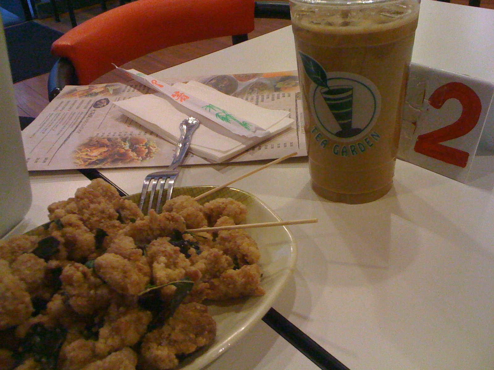 My standard Beverage of Indecision (coffee-tea-milk, no sweetener added) ($3.75)-no sweet at all. I could taste each of the three ingredients distinctively. Very nice. An appetizer of popcorn chicken ($3.99). Crispy and moist, mild thin breading flavored with fresh basil leaves (on the plate) from the fryer.