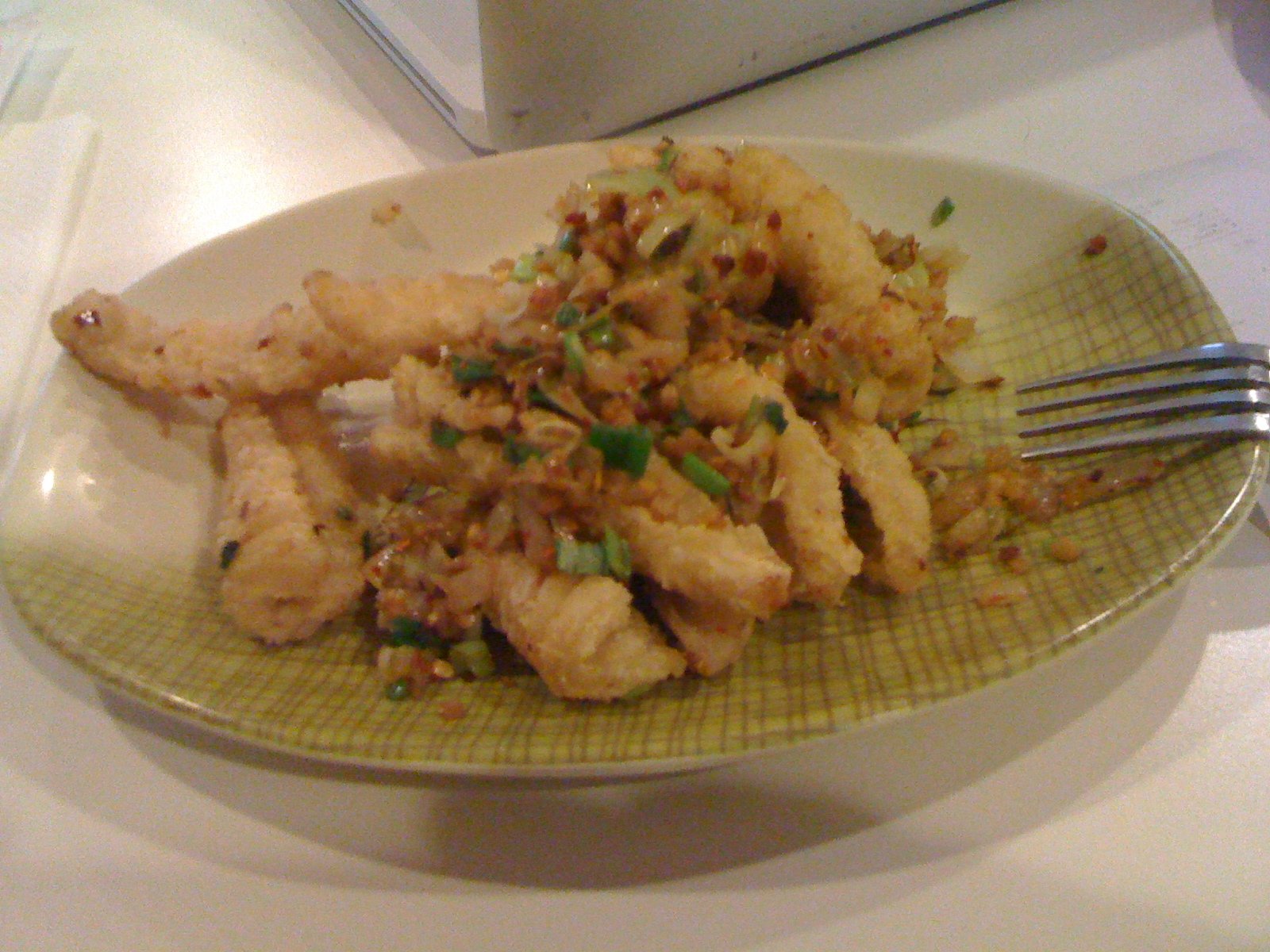 An appetizer of salt and pepper squid ($6.99) Soft squid, light breading topped with a relish of garlic, scallions and red pepper. Just enough heat.